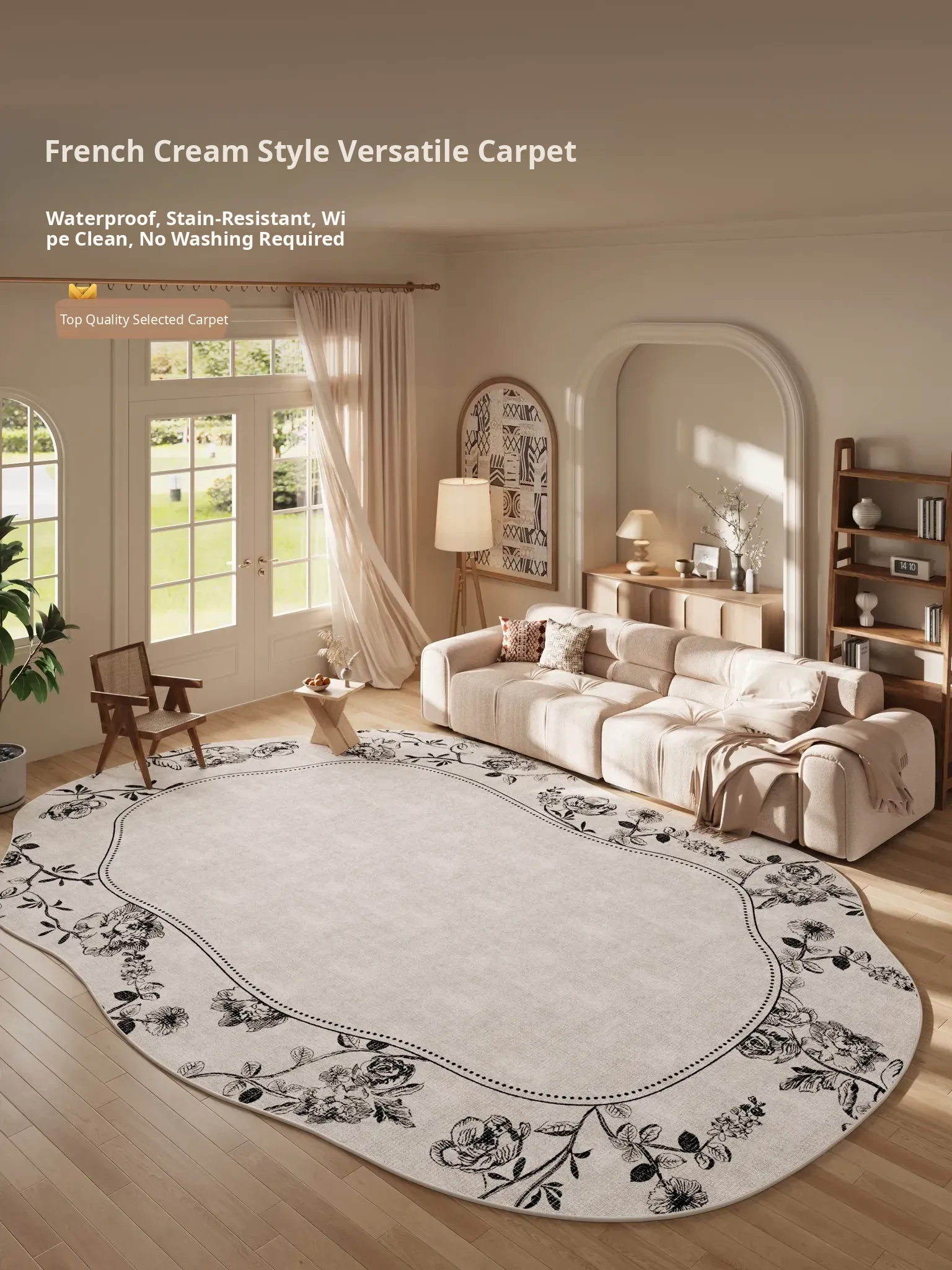 French-Inspired Unique Area Rug for Living Room - Vintage Waterproof and Stain-Resistant Cream Sofa Mat, No Wash Needed, Perfect for Bedroom and Coffee Table Decor