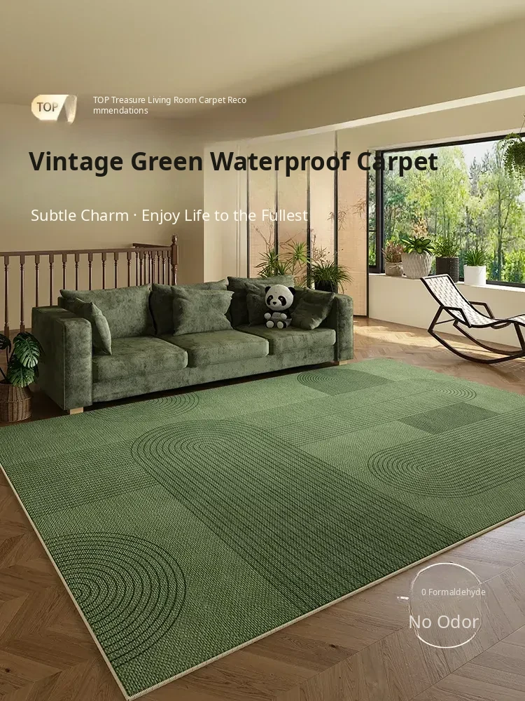 2025 New Waterproof and Stain-Resistant Green Carpet for Living Room - Effortless Care, French Style Sofa and Coffee Table Design, Perfect for Creamy Bedroom Aesthetic by the Bed