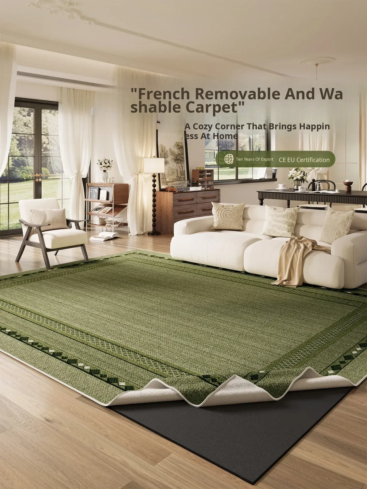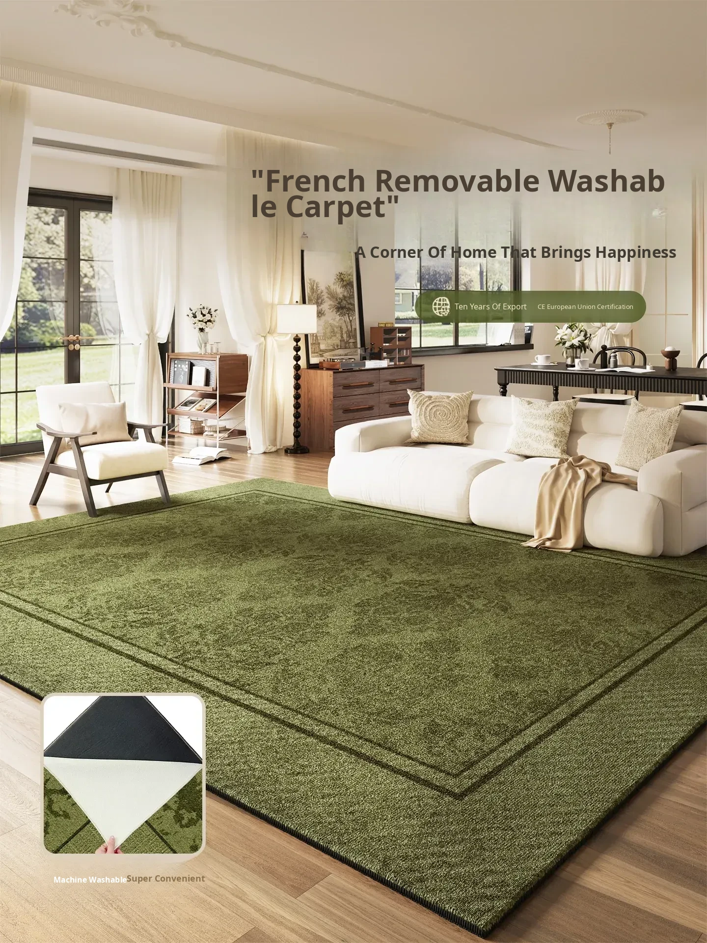 French Style Green Double-Layer Washable Carpet for Living Room - Removable and Machine Washable Sofa Mat, Vintage Aesthetic for Bedroom - Elevate Your Home Décor!