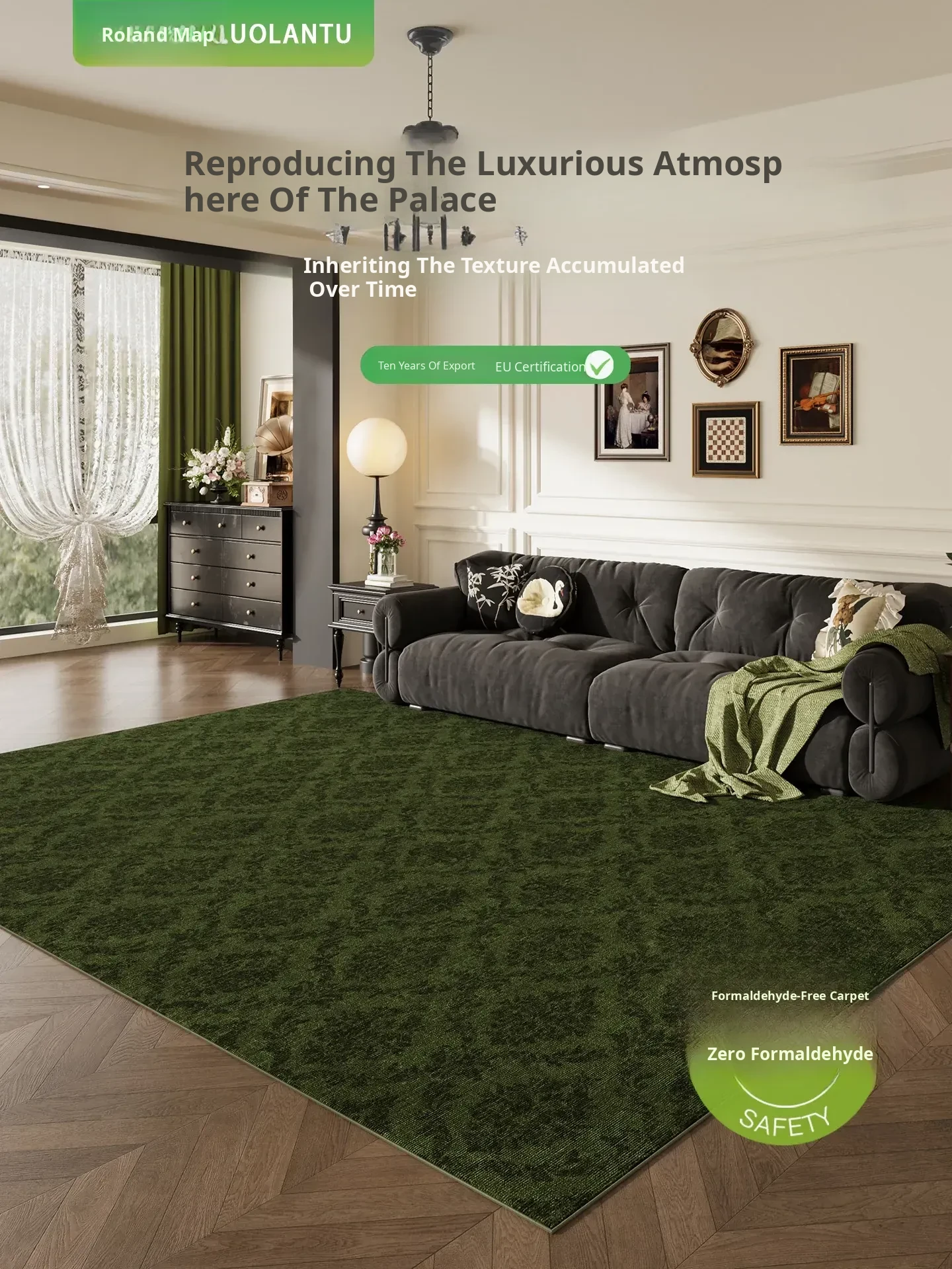 Vintage Green Carpet - Stylish Living Room, Sofa, and Bedroom Area Rug, Easy to Clean, Stain-Resistant, Waterproof, No Maintenance Required, Luxurious Feel