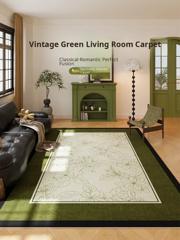 2025 New Green Vintage Area Rug for Living Room - French American Style, No Maintenance, Stain-Resistant Sofa Mat for Bedroom and Coffee Table