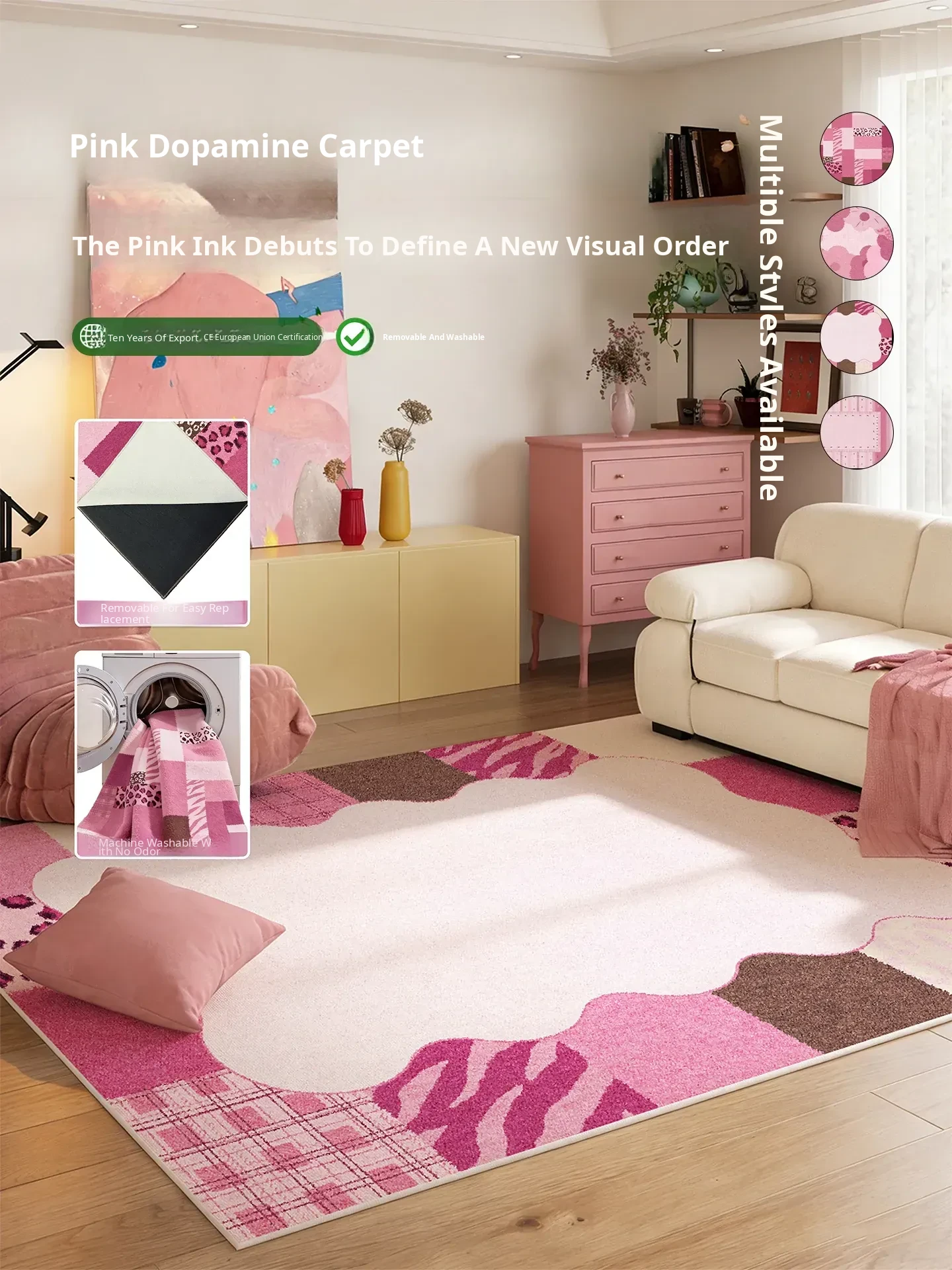 Pink Removable Washable Plush Carpet for Living Room - Double Layer Machine Washable Bauhaus Area Rug, Perfect for Dopamine Decor and Bedroom Use