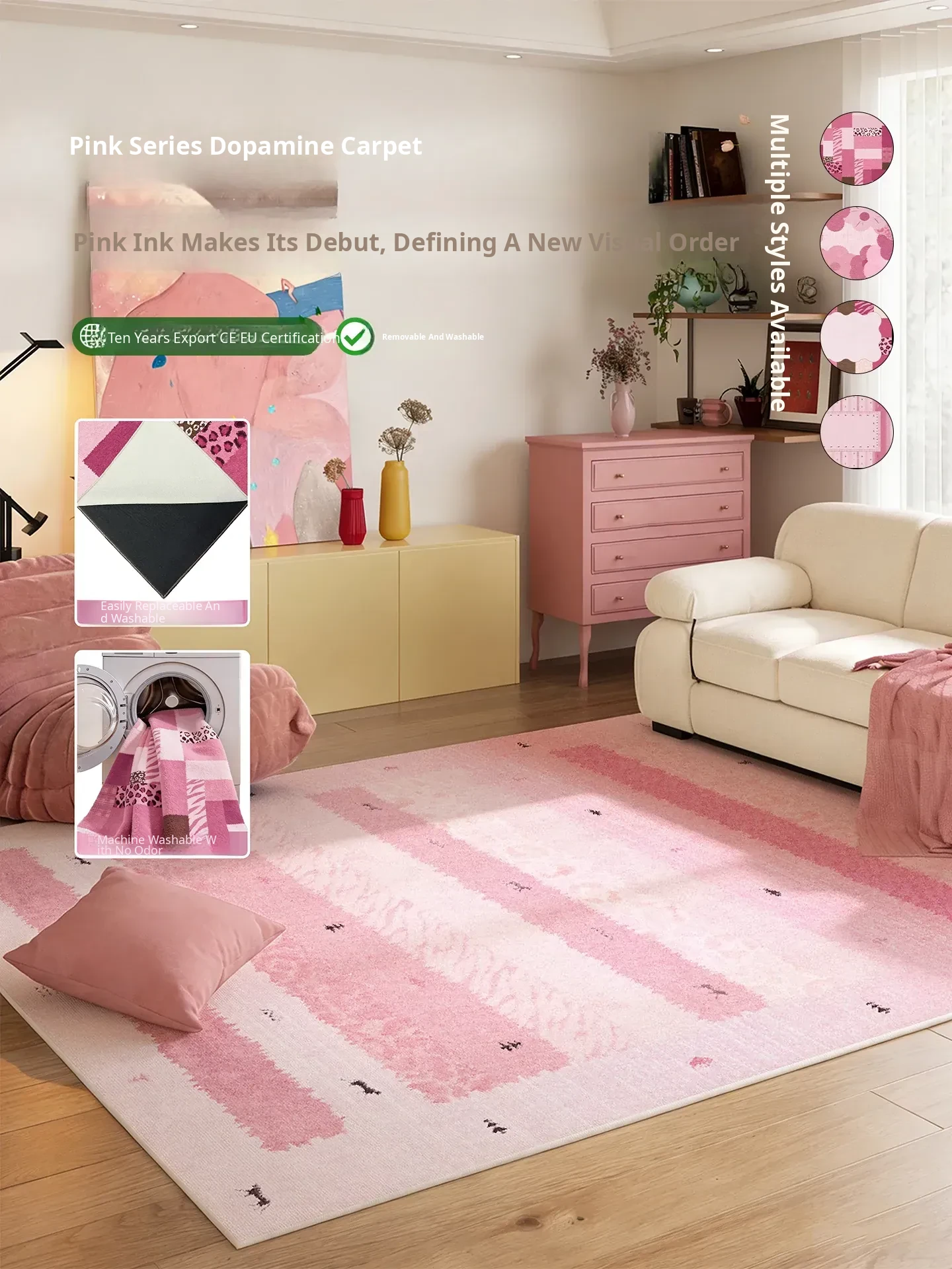Dopamine Removable Washable Area Rug - Pink Bauhaus Double-Layer Design for Living Room and Bedroom, Perfect for Bedside Use - Soft, Stylish, and Easy to Clean!