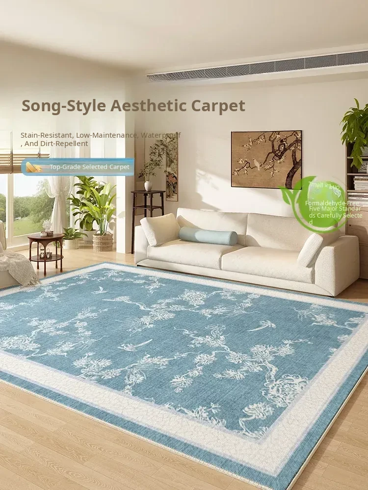 Elegant Song Dynasty Aesthetic Waterproof and Stain-Resistant Carpet for Living Room - Easy-Care Sofa Mat, Washable and Wipeable, New Chinese Style in Blue