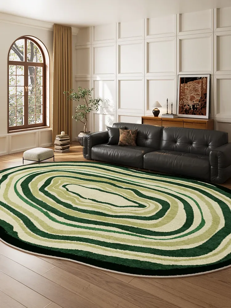 リビングルームにぴったり!おしゃれな緑の異形ラグ、ソファやテーブルに最適。お手入れ簡単で水洗い可能、レトロでヴィンテージな雰囲気を演出します。あなたの部屋を一新するアイテム!