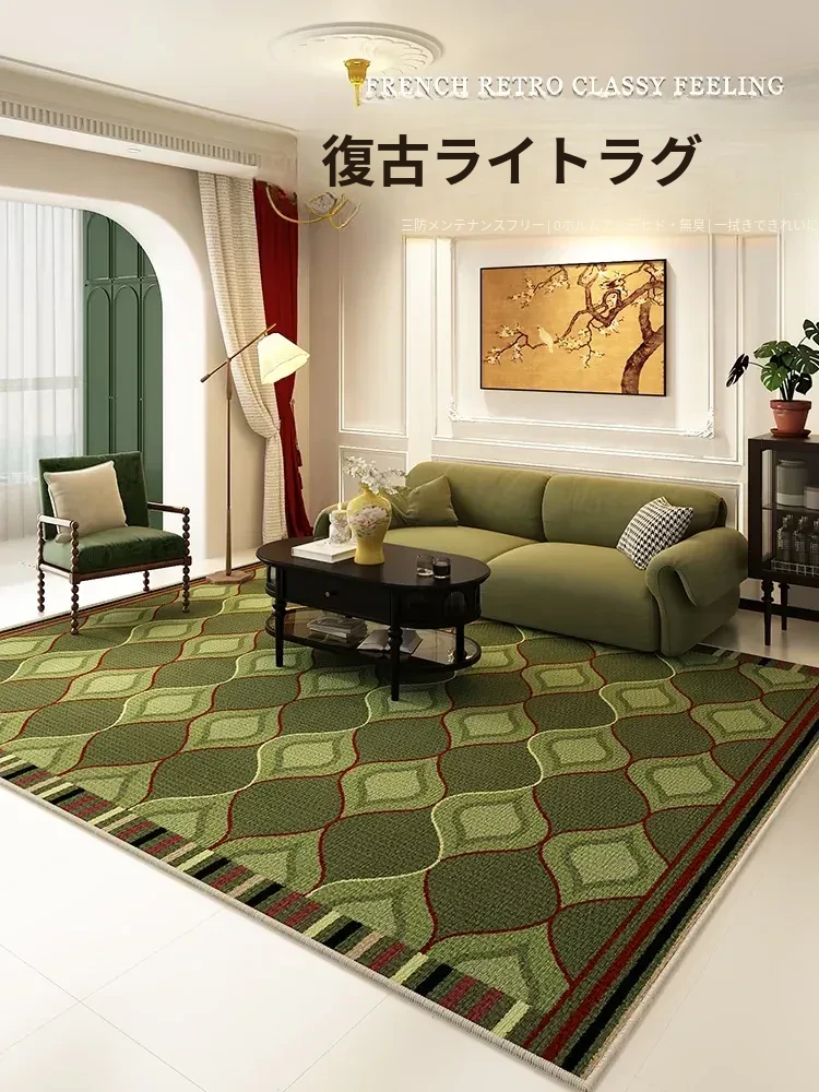 フランス風グリーンアメリカンカーペット!リビングソファ用の新作、手間いらずでお手入れ簡単!テーブルマットとしても最適、防水・防汚機能付きで安心。おしゃれな空間を演出します!