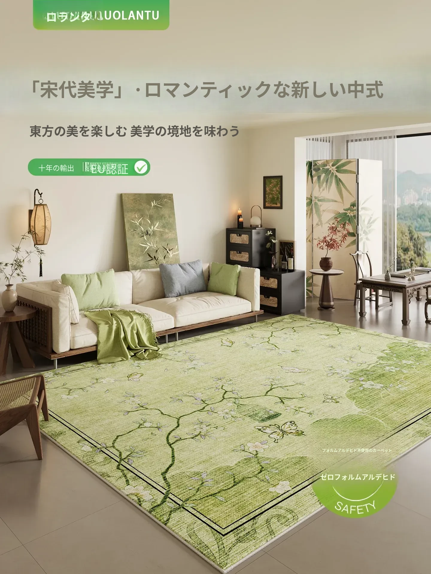 新中式デザインのグリーンカーペット - 宋代の美学を取り入れた防水・防汚機能付き。お手入れ不要で、リビングや寝室のソファ、テーブルに最適な新作アイテム!