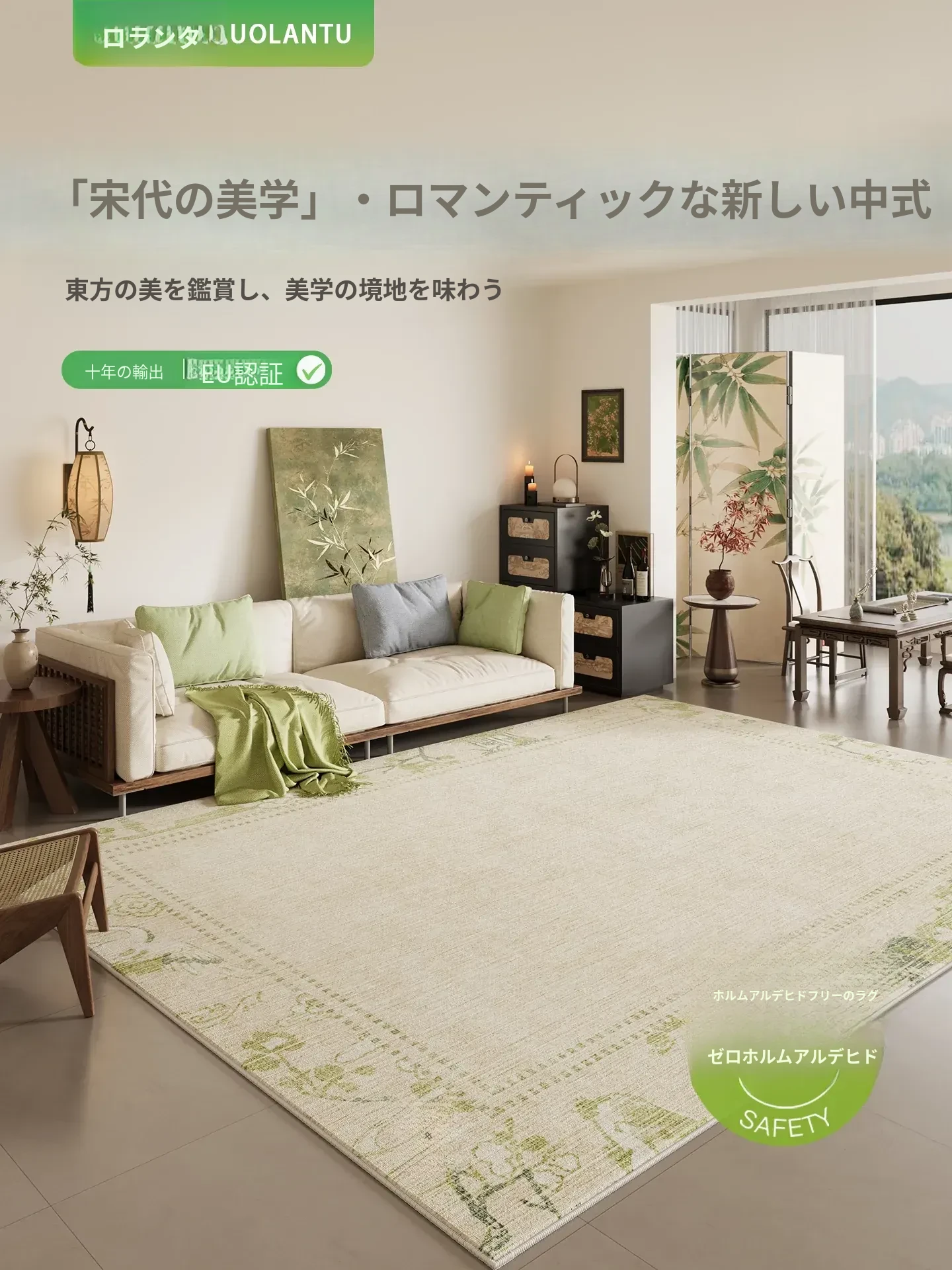 新中式美学の緑色の宋代スタイルカーペット - 防水・お手入れ簡単!リビングルームや寝室に最適なソファやテーブル用の汚れ防止マット。新作登場!