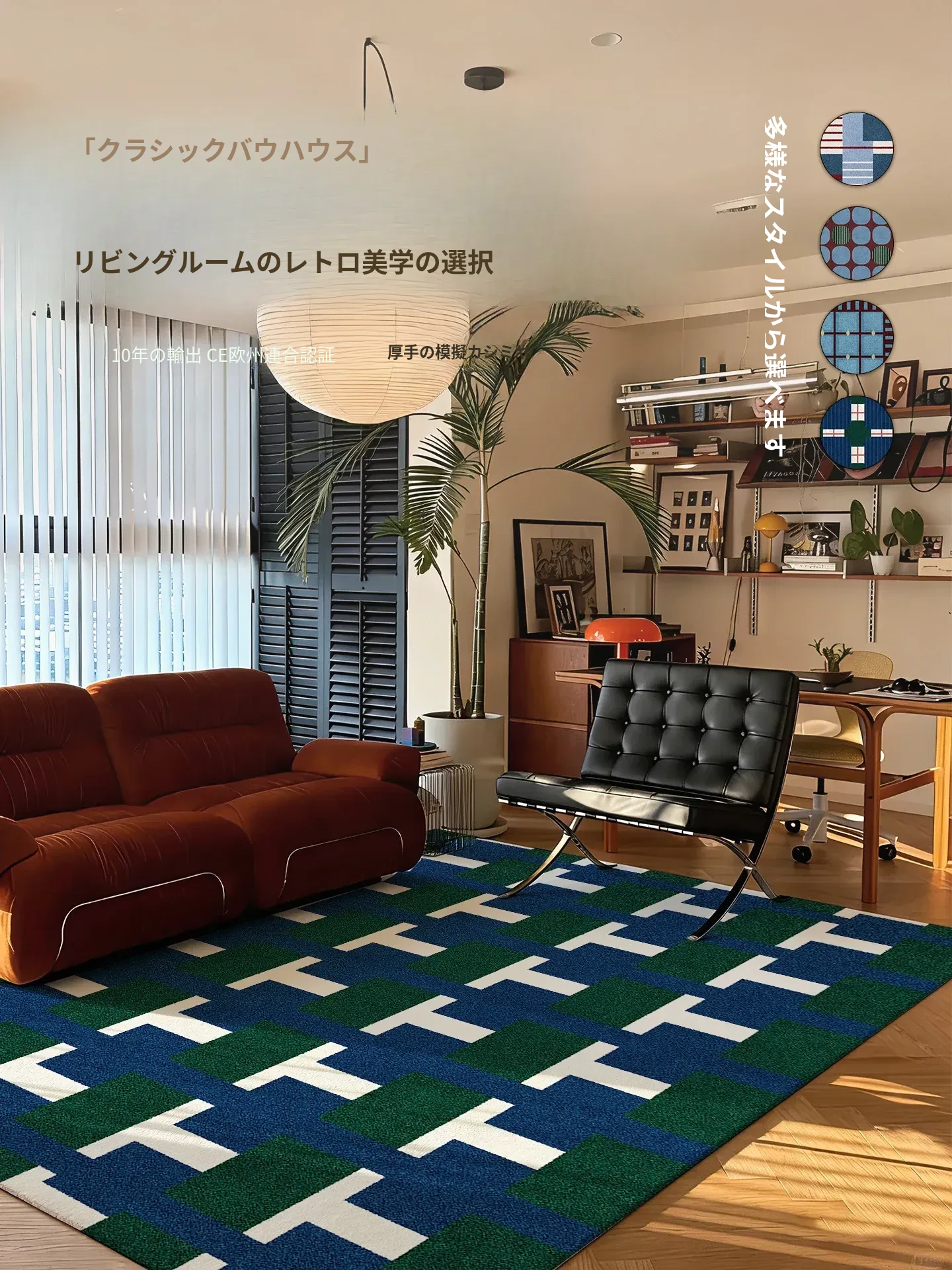 おしゃれなバウハウス風カーペット|リビングにぴったり!水洗い不要、簡単お手入れの高級ヴィンテージデザイン|防水機能付きで、ソファやテーブルの下に最適なミニマルスタイルのマット!