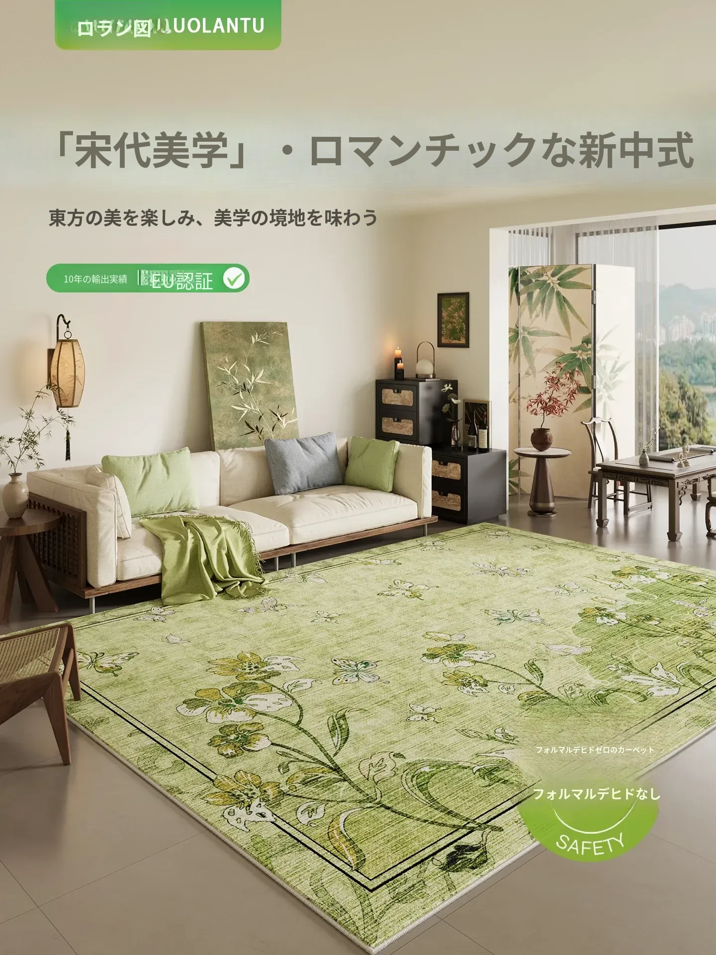 緑色新中式リビングカーペット - 茶卓と宋代美学が融合した高級感溢れるソファマット!お手入れ簡単、撥水・防汚機能付きで、快適な空間を演出します。