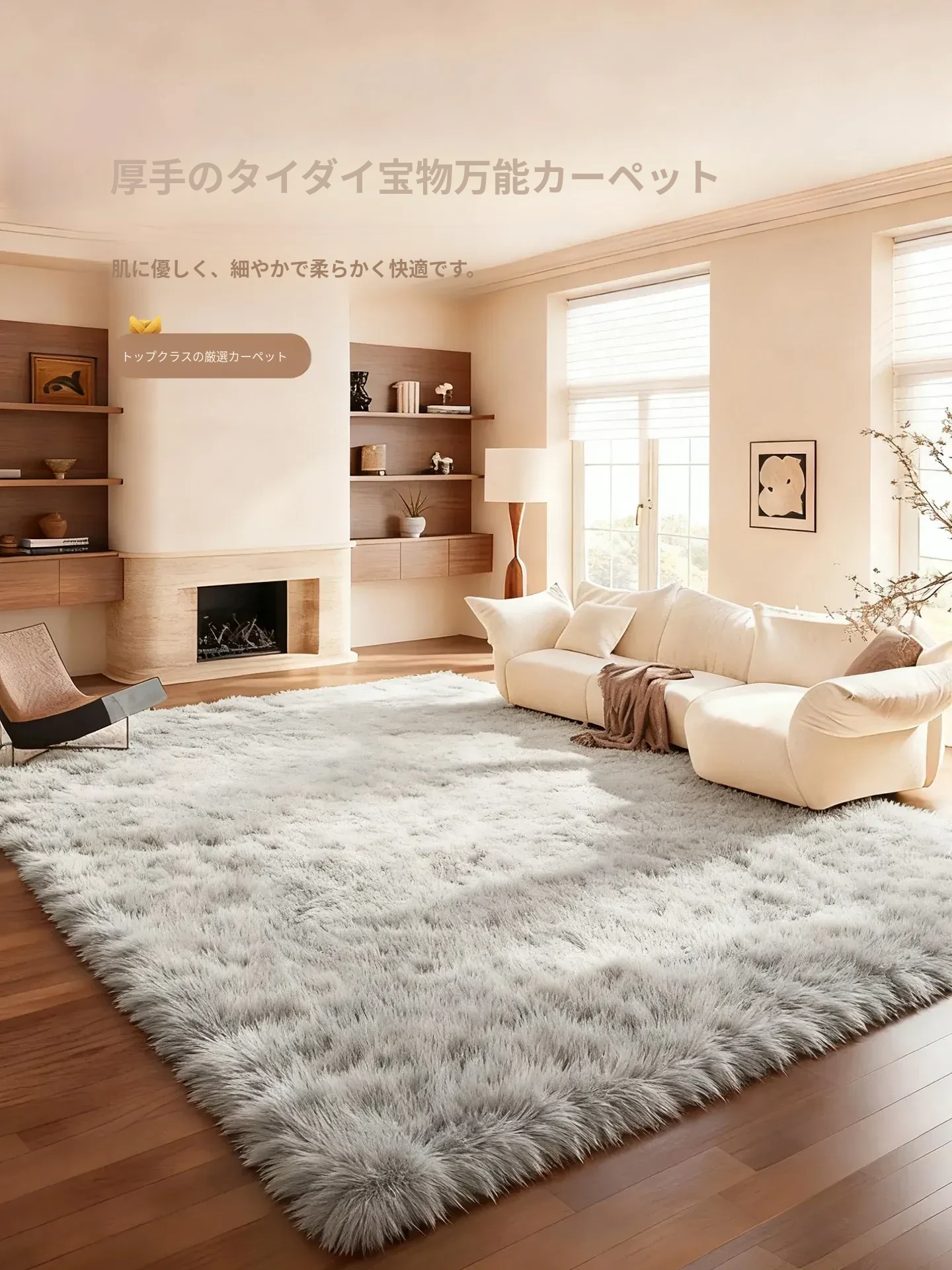 冬のリビングに最適!グレーのふわふわカーペット - ソファやベッドサイドにぴったりなクリーミーなデザイン。高級感あふれる厚手のマットで、温かみのある空間を演出します。