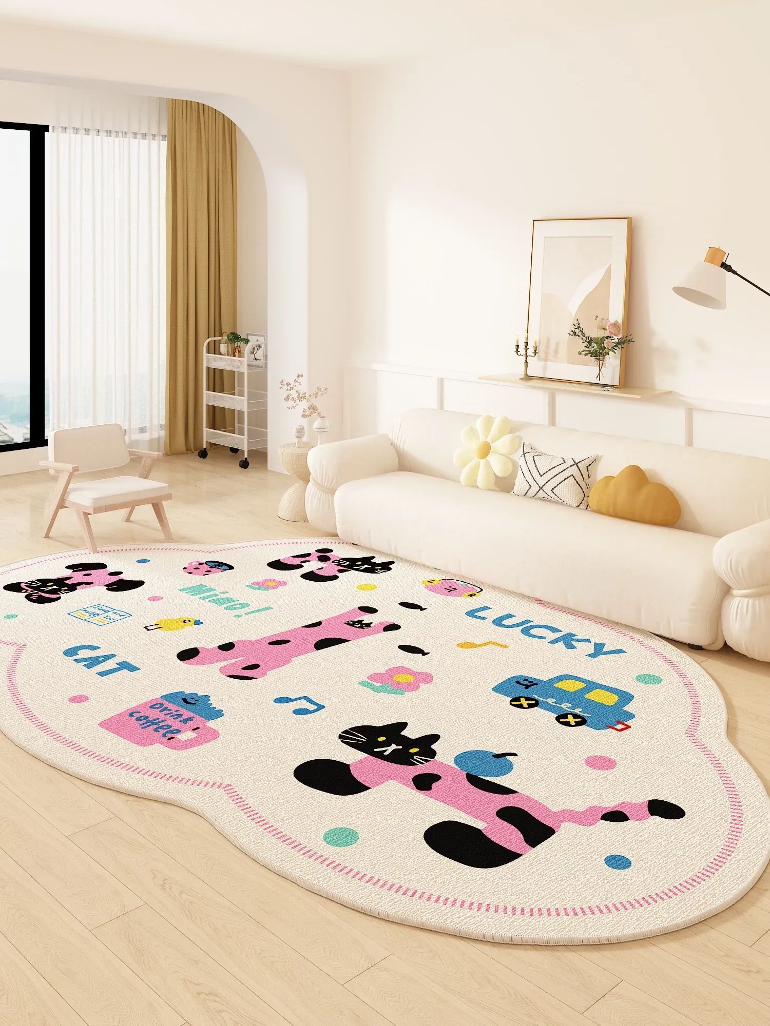 クリーミーカラーの可愛いカートゥーンラグ|リビングや寝室に最適!お手入れ不要、防水・防汚機能付きで、ソファやテーブルの下にぴったりな新作マット!