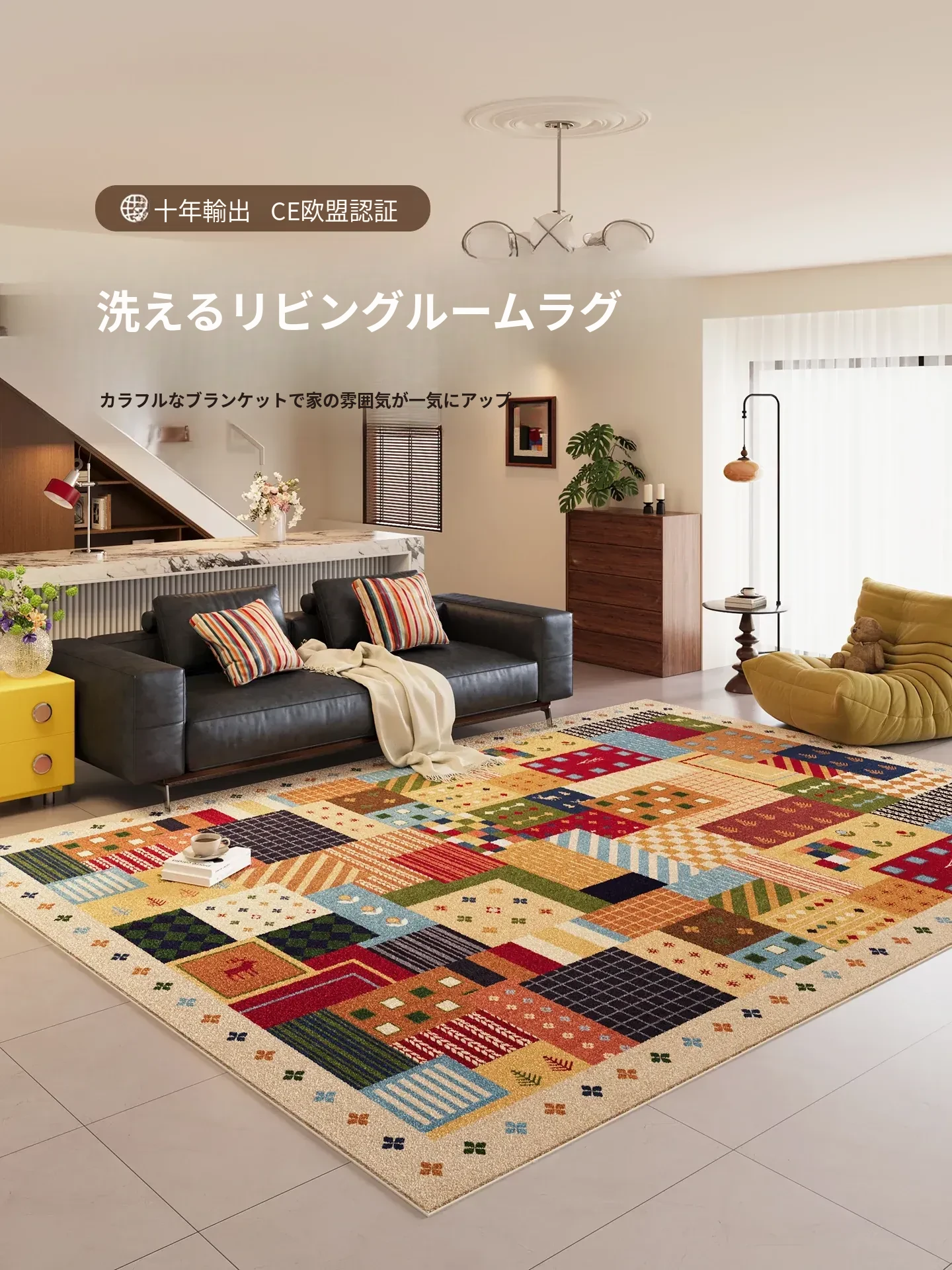 レトロなヴィンテージ風カーペット|防水・防汚でお手入れ簡単!リビングや寝室にぴったりのマルチユースデザイン。テーブルやソファの下にも最適、洗濯不要で忙しいあなたに最適なアイテムです。