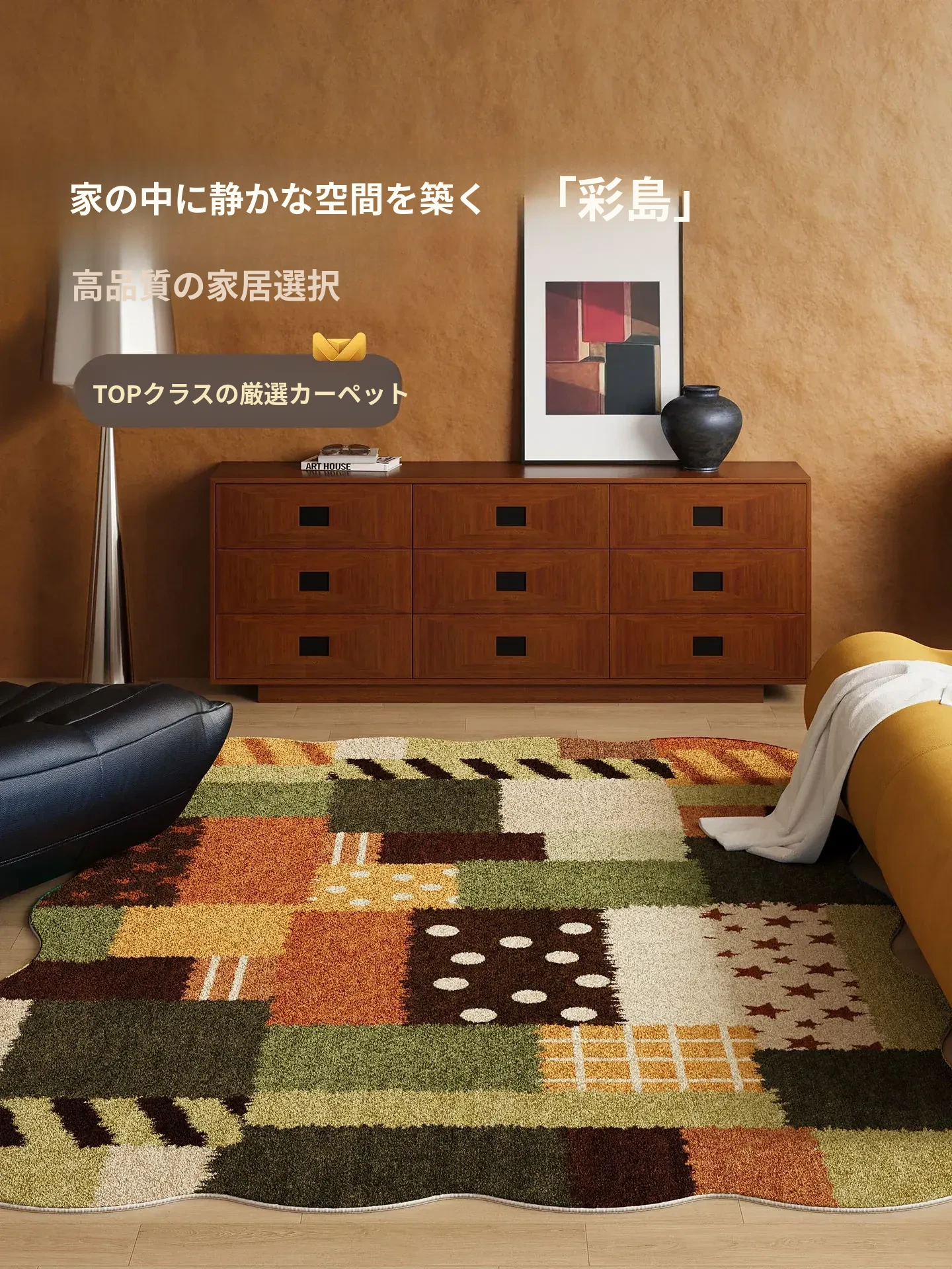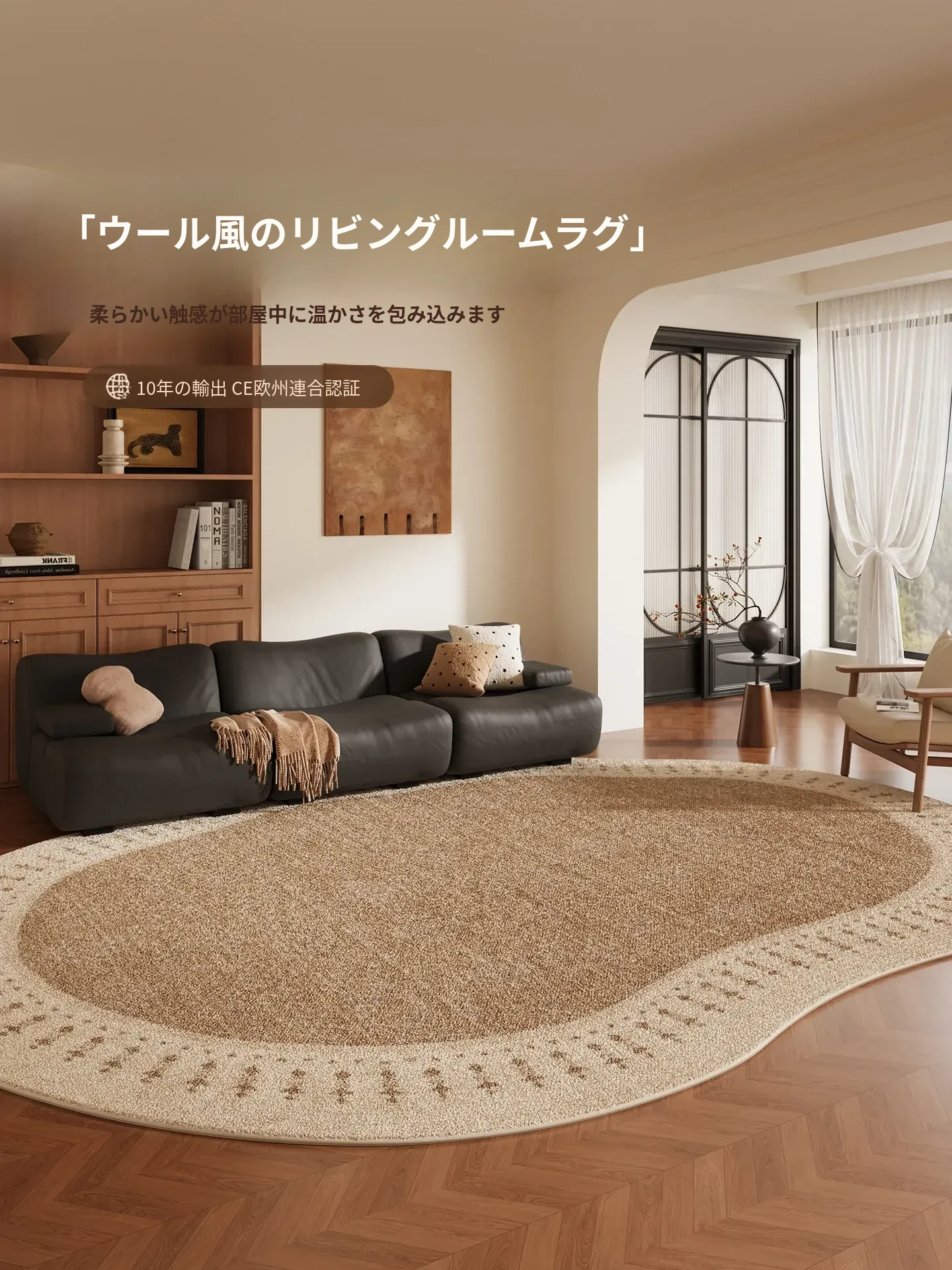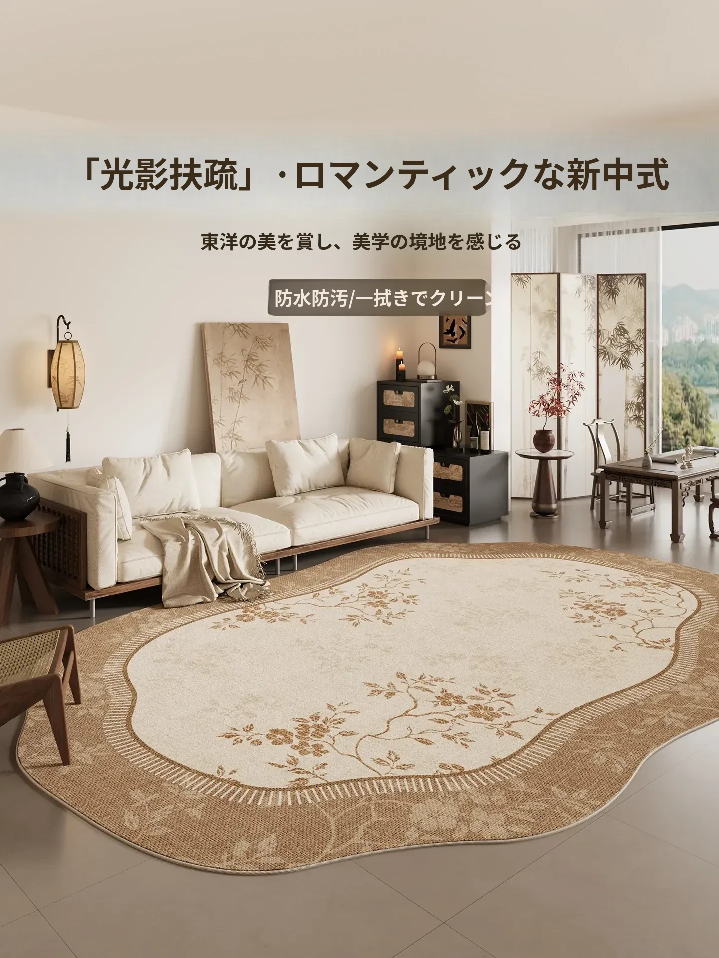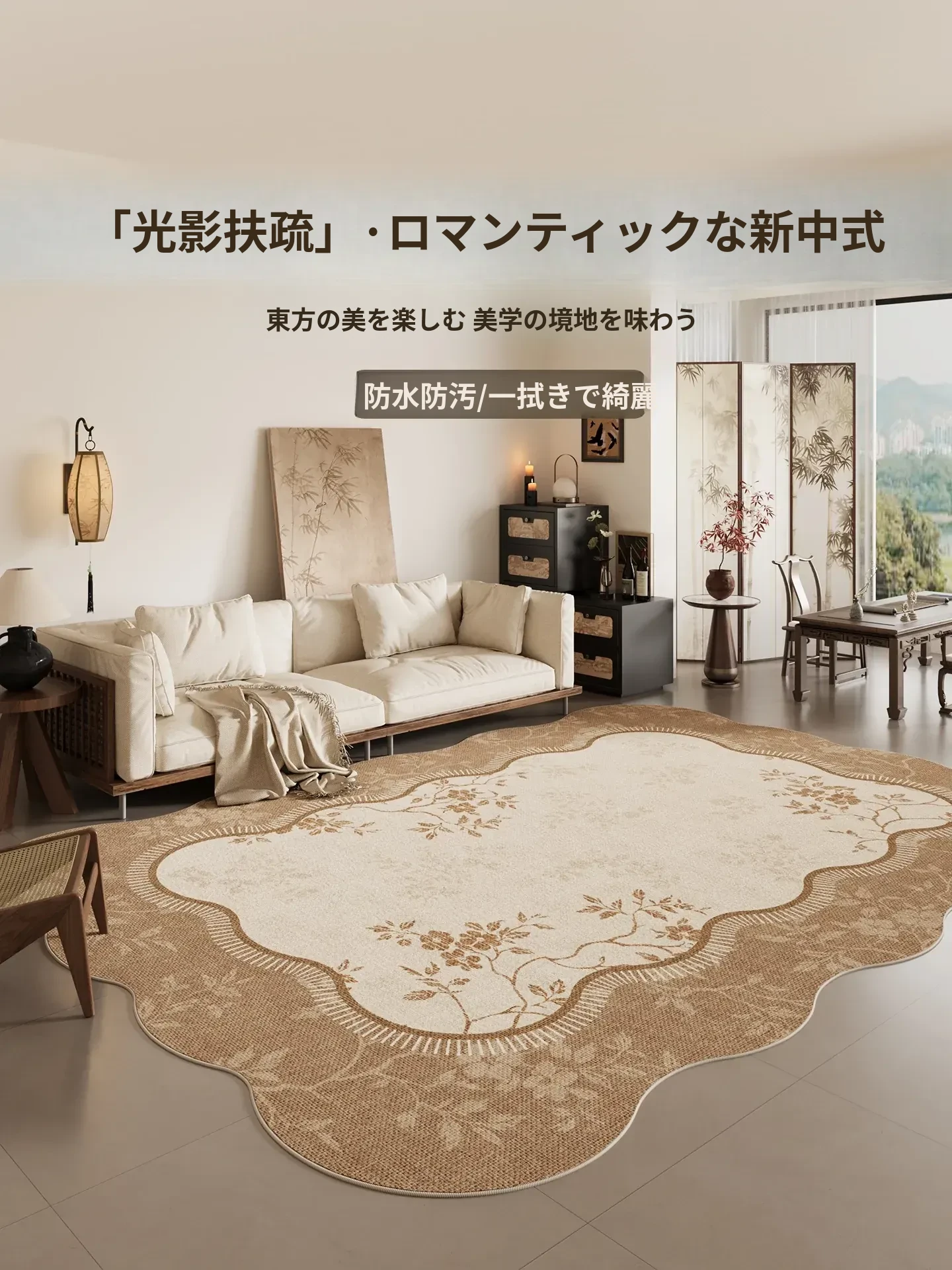 2025年新作!洗わずに使える新中式デザインのラグ、リビングにぴったり。お手入れ簡単で、ソファやテーブルに最適な高級感あふれる異形マット!