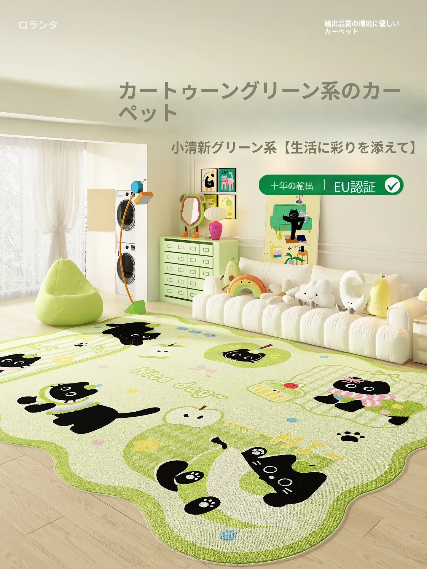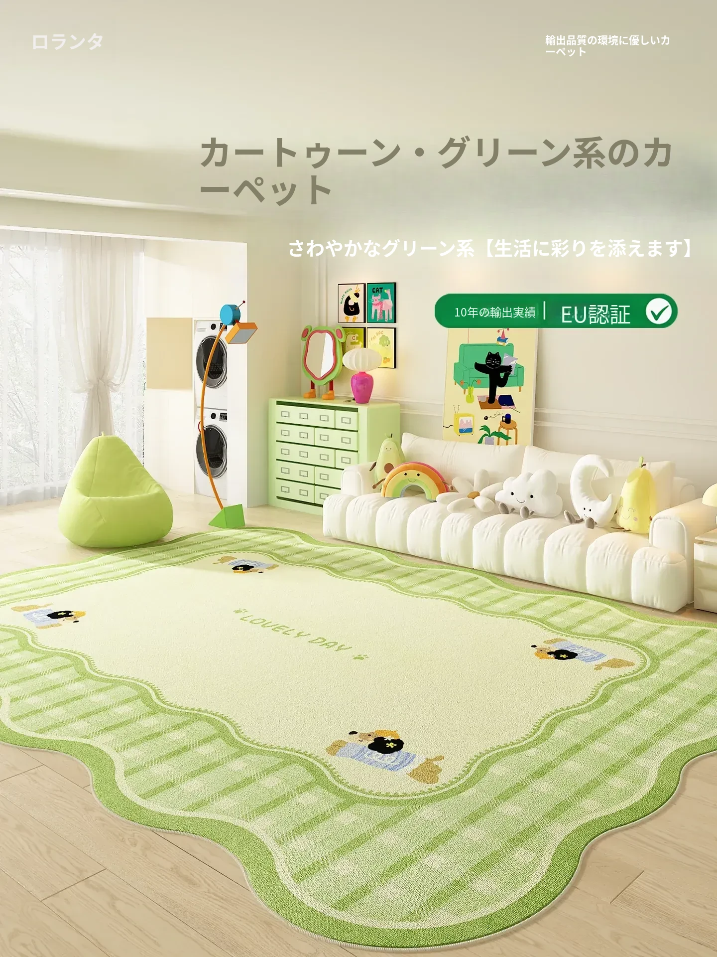 防水・お手入れ簡単!新作グリーンカーペット、リビングにぴったりの不規則な円形ラグ。カートゥーンデザインで、厚手の素材が魅力的。茶卓の汚れを防ぎ、心地よい空間を演出します!