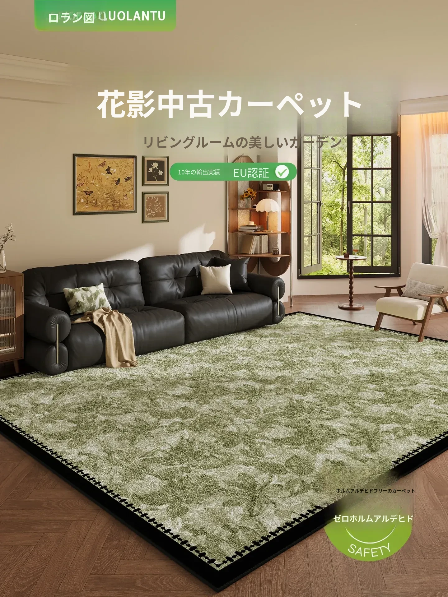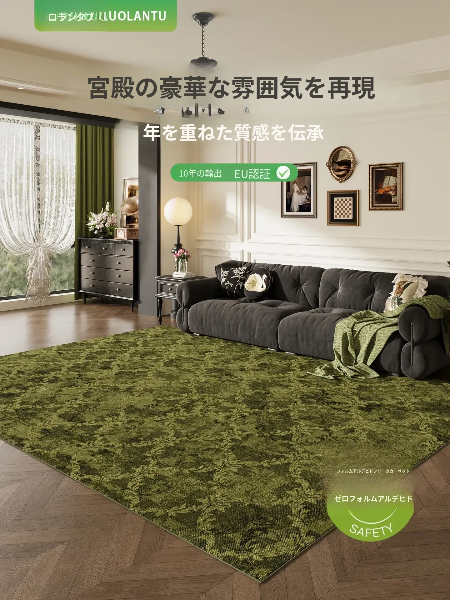 防水・メンテナンスフリーのヴィンテージ風カーペット!リビングや寝室にぴったりの新作グリーンデザイン。ソファやテーブルの下に最適なフランス風のふわふわラグで、心地よい空間を演出します。