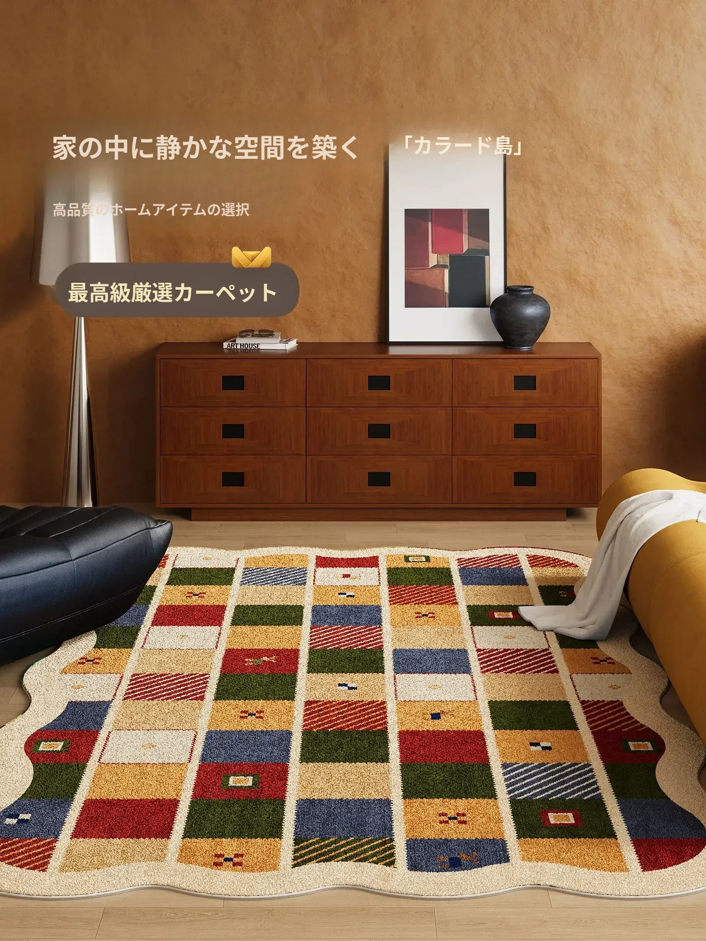 ドーパミンカーペット - リビング・寝室に最適!お手入れ簡単、防水・防汚のフワフワマット。バウハウス風のレトロデザインで、冬の暖かさを演出します。