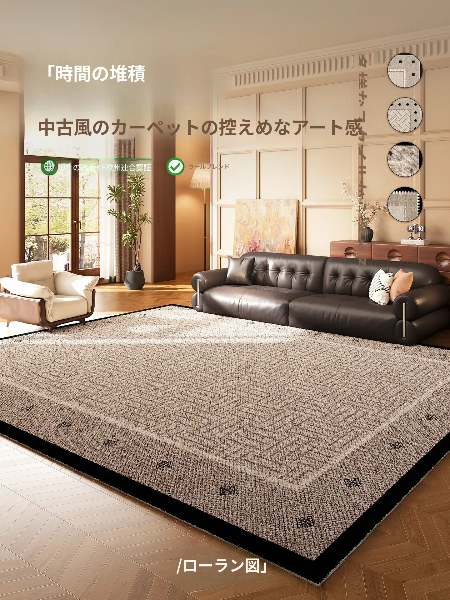 レトロなヴィンテージ風カーペット|防水・防汚でお手入れ簡単!リビングや寝室にぴったりのマルチユースデザイン。テーブルやソファの下にも最適、洗濯不要で忙しいあなたに最適なアイテムです。