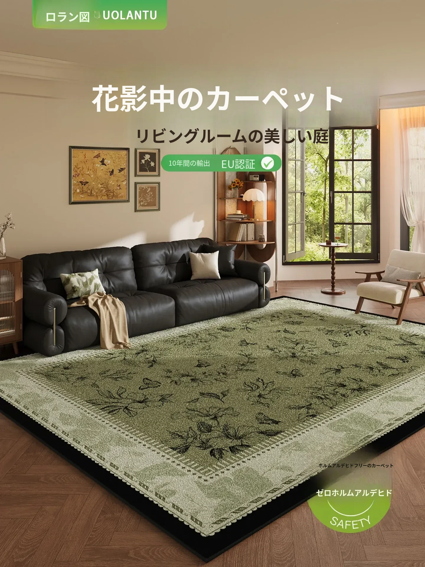 防水・メンテナンスフリーのヴィンテージ風カーペット!リビングや寝室にぴったりの新作グリーンデザイン。ソファやテーブルの下に最適なフランス風のふわふわラグで、心地よい空間を演出します。