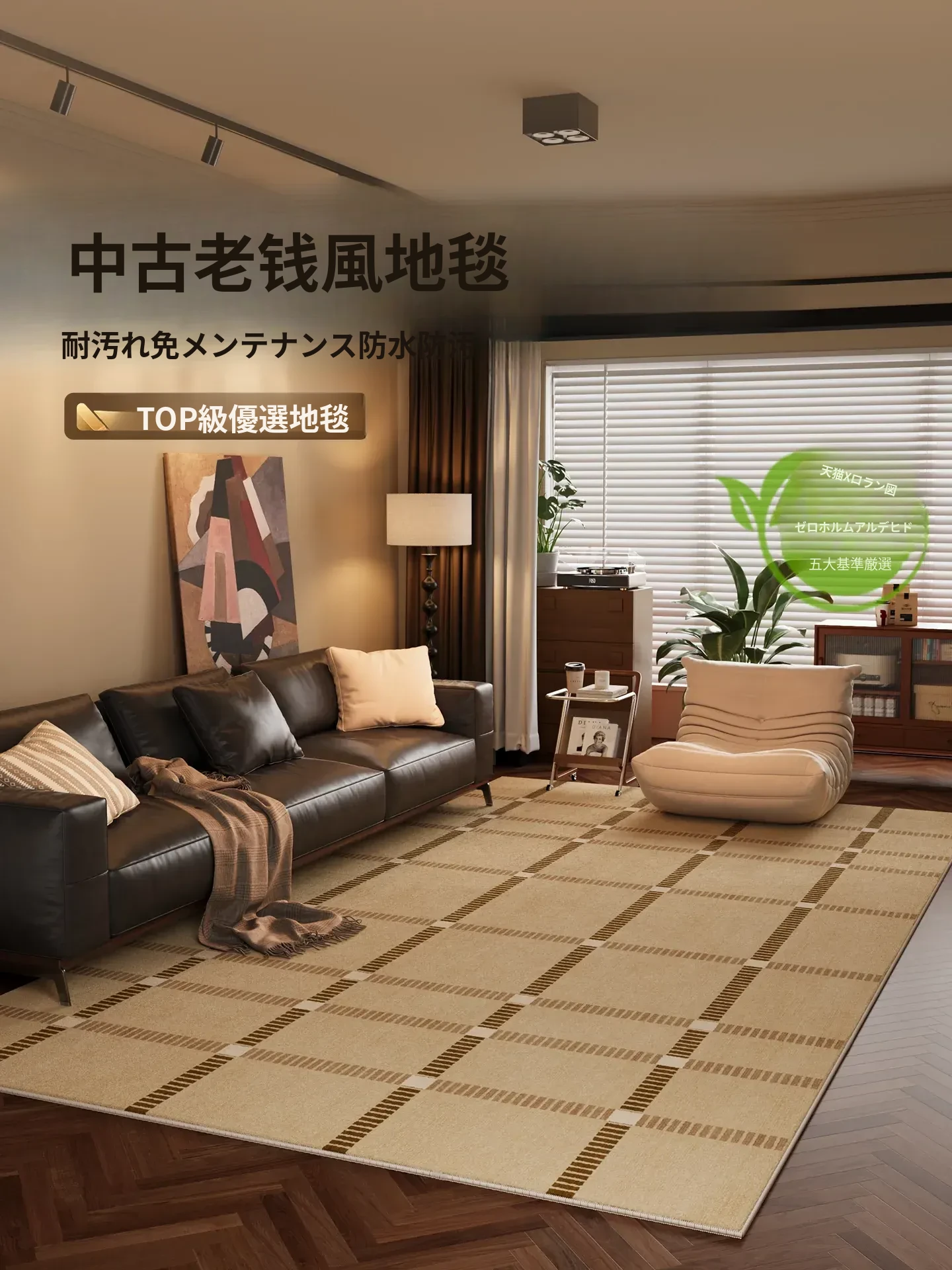 新作!防水・防汚・洗浄不要の中古風カーペット!リビングや寝室にぴったりの高級感ある厚手デザイン。ソファやテーブルの下に最適!おしゃれで機能的な空間を演出します。