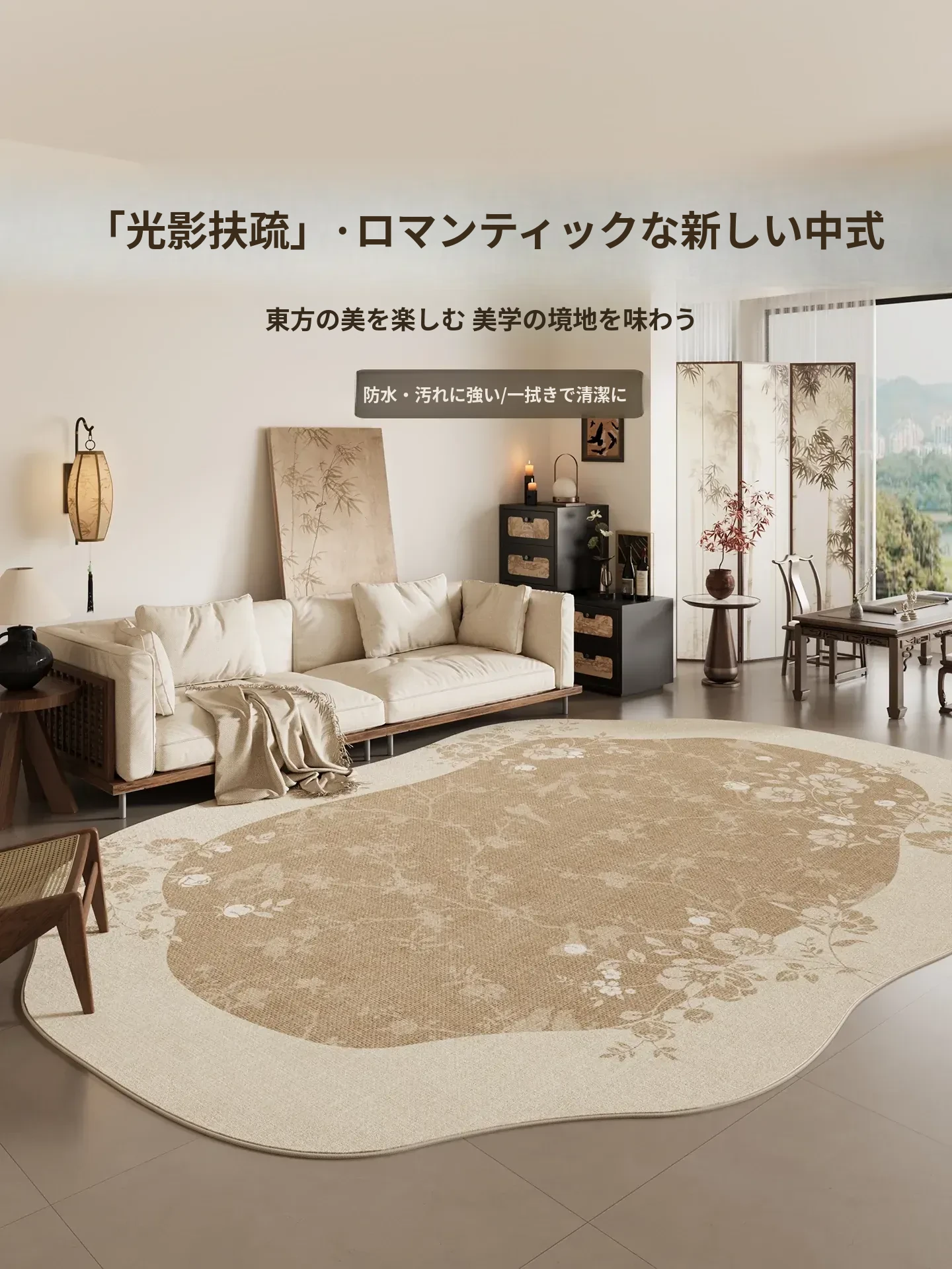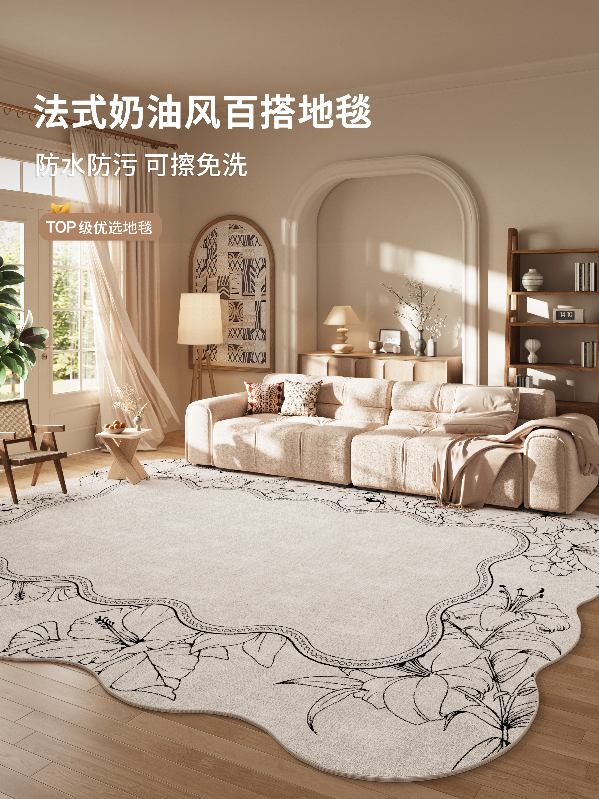 クリーム風の多幸感あふれるリビングカーペット!洗濯不要でお手入れ簡単、羊毛風のデザインが魅力的。ユニークな形状でソファやテーブルをスタイリッシュに演出し、防水機能付きで安心。快適な空間を作り出します!