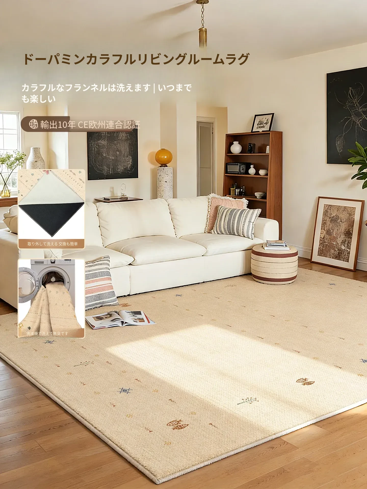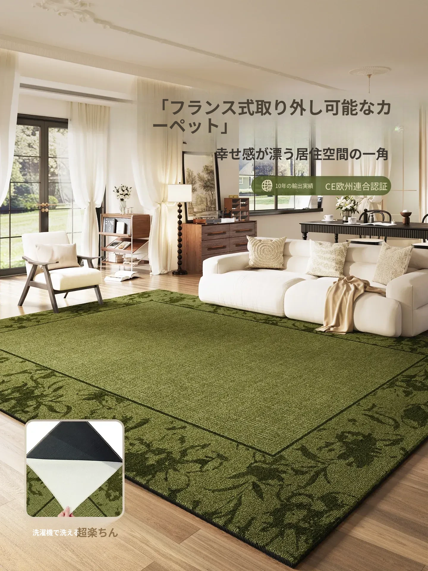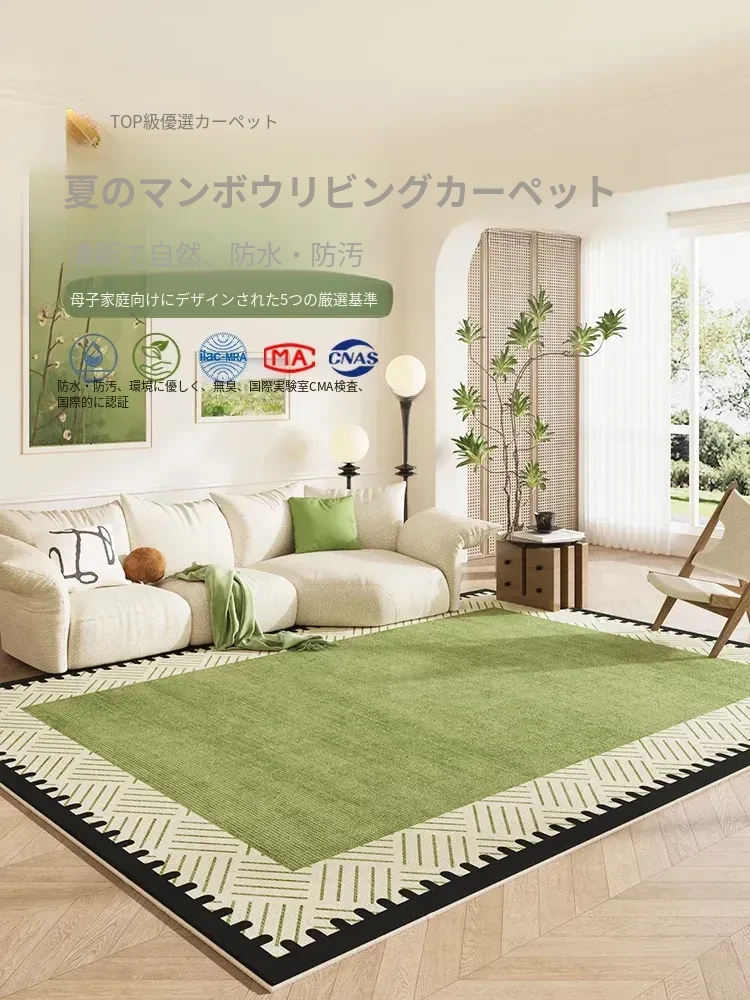 フランス風クリームカラーのカーペット、リビングに最適!お手入れ不要で、グリーンのアメリカンスタイル、撥水・防汚効果付き。新作の洗わずに拭けるマットで、快適な空間を演出!