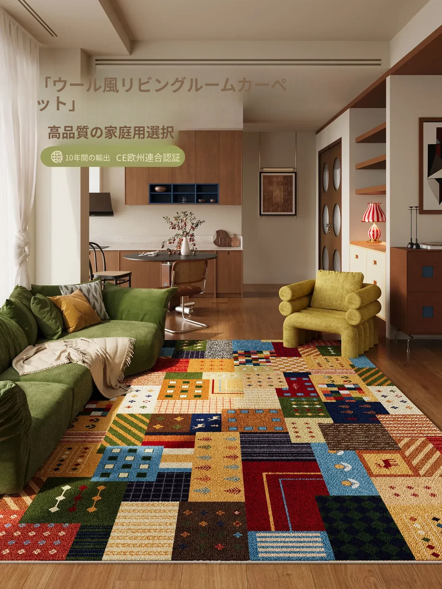 レトログリーンのリビングルームカーペット - ソファやテーブルにぴったり!防水・手入れ不要・簡単拭き掃除可能。ユニークな形状で、寝室にもおすすめの中古風デザイン!