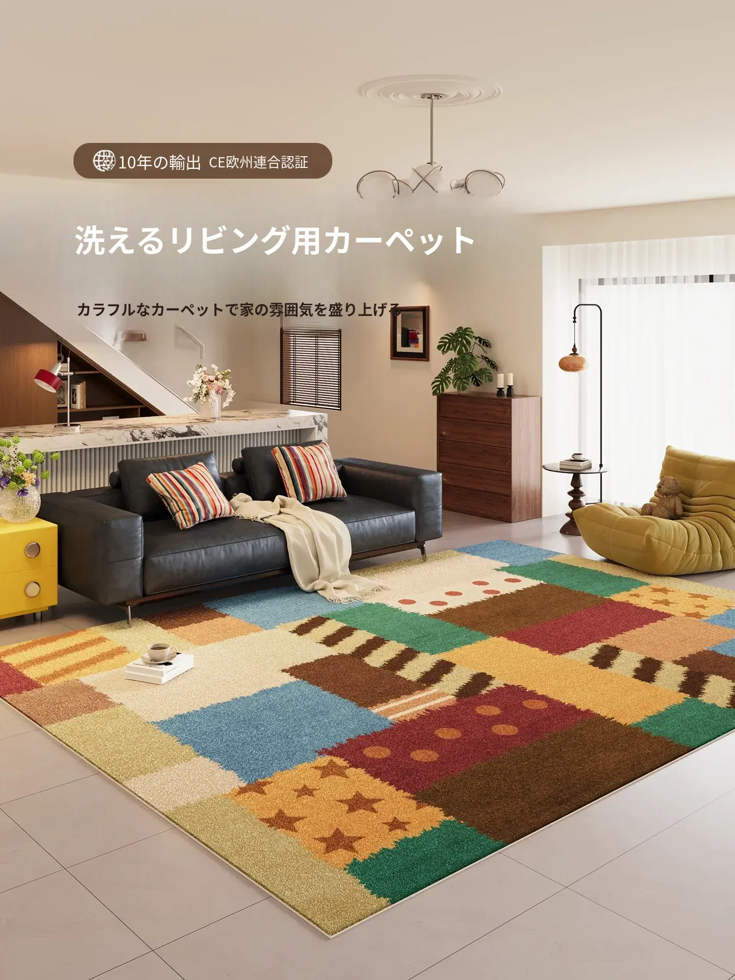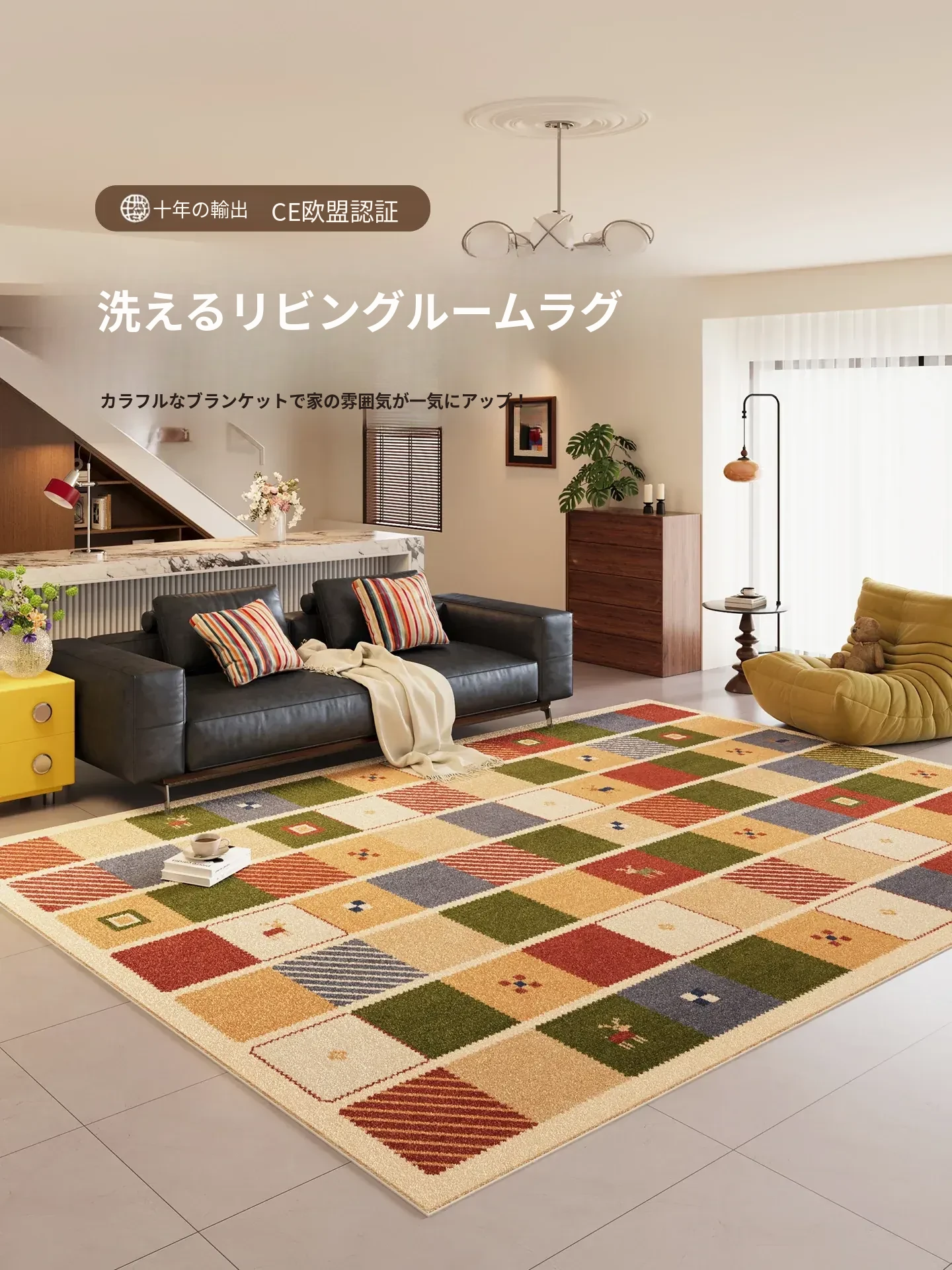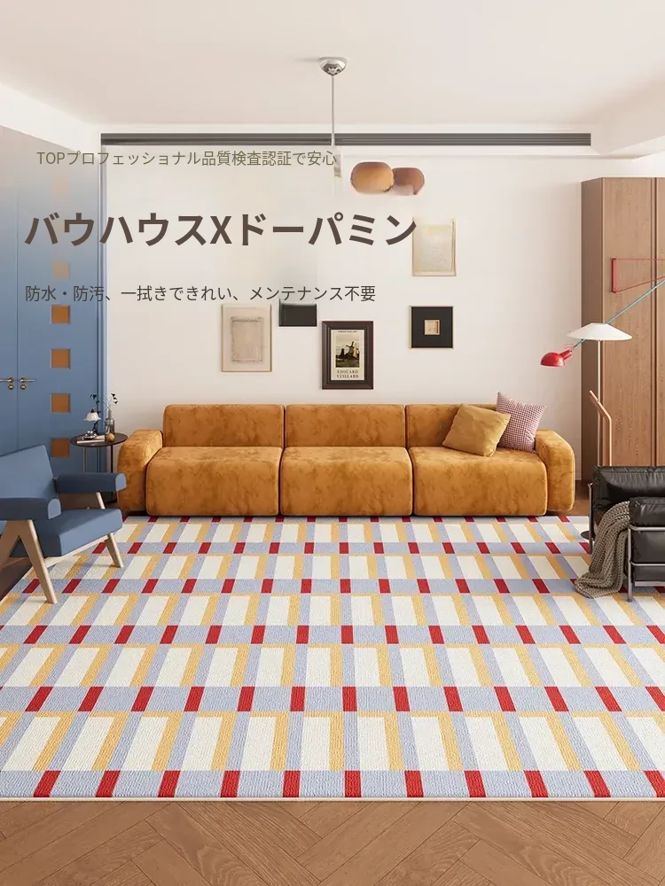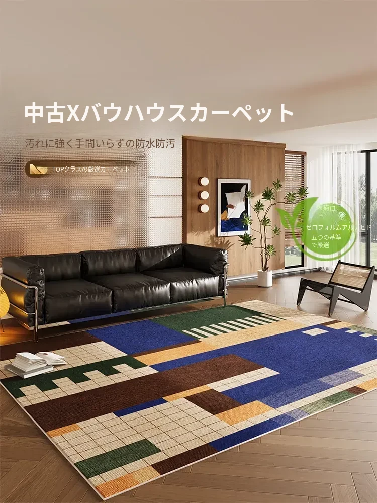 カラフルなリビングルームラグ - ミニマリストソファとコーヒーテーブルにぴったり!バウハウススタイルの防水・お手入れ簡単なレトロデザイン、洗練された新作で快適な空間を実現!