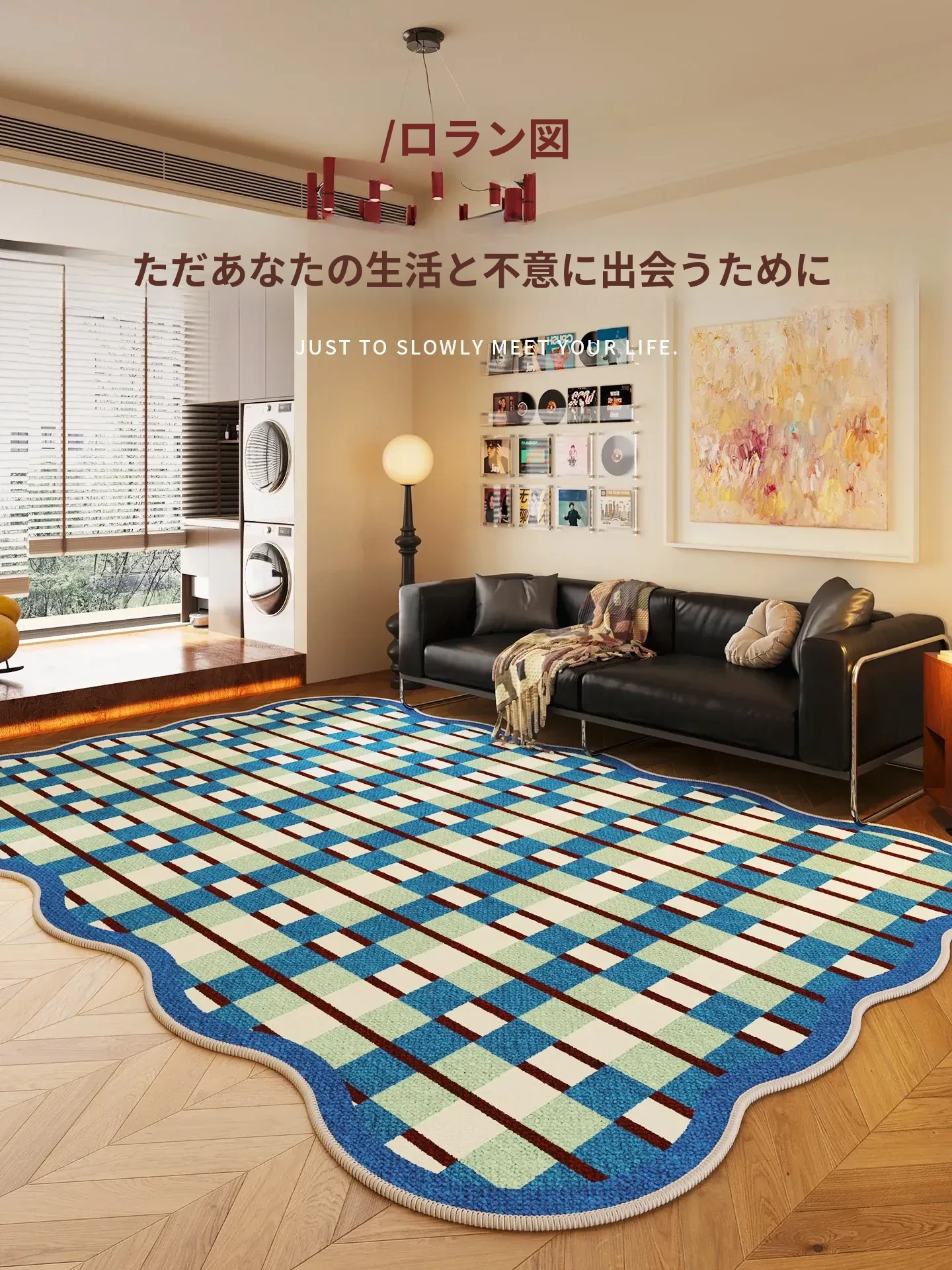 バウハウス風カーペット|リビングにぴったりなミニマリストソファ&お手入れ簡単なティーテーブル|防水・ヴィンテージスタイルのブルーカーペット|おしゃれで機能的!