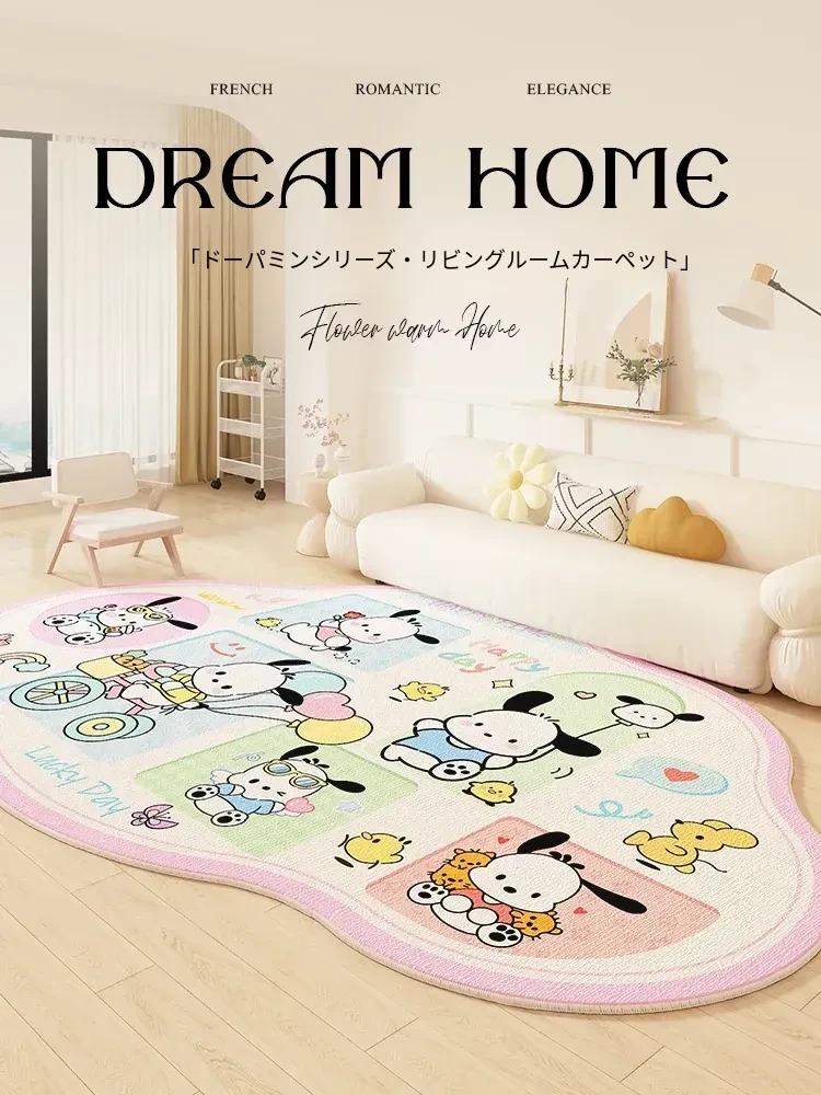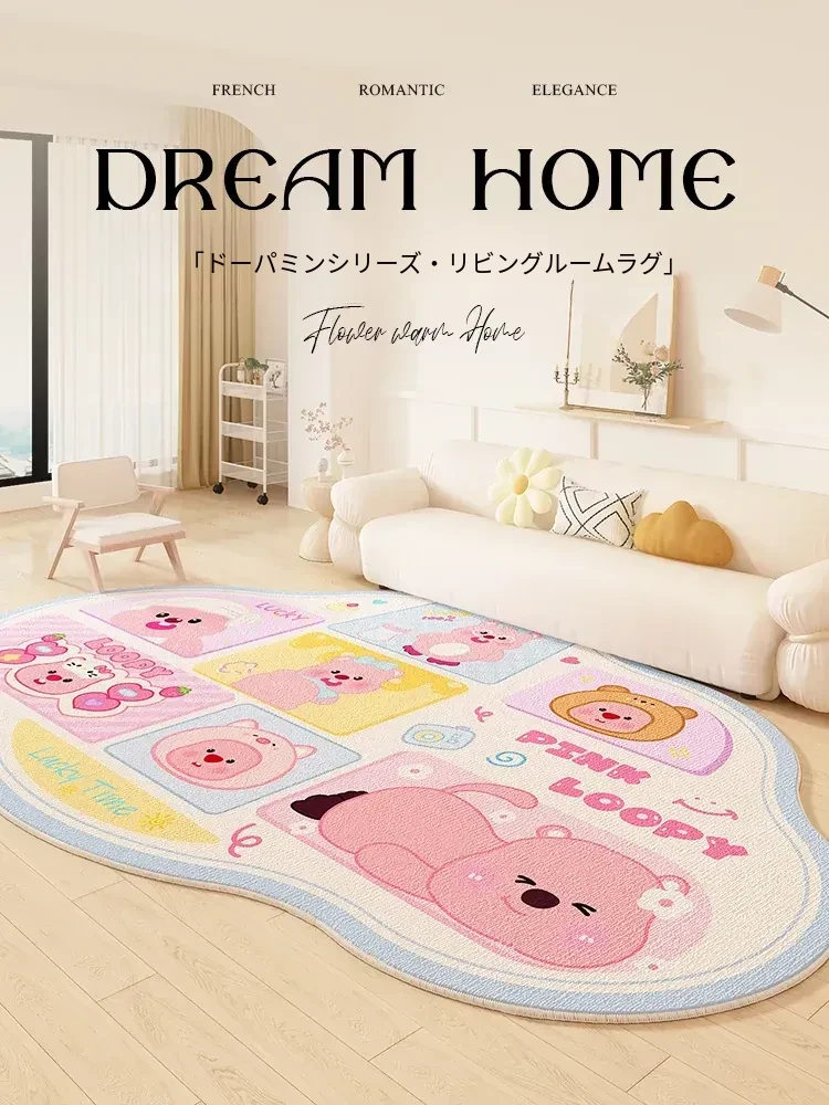 可愛いカートゥーンデザインの防水防汚リビングルーム用ラグ - ピンクの女の子の部屋にぴったり!手入れ不要でソファやテーブルの下に最適。おしゃれで便利なインテリアアイテム!