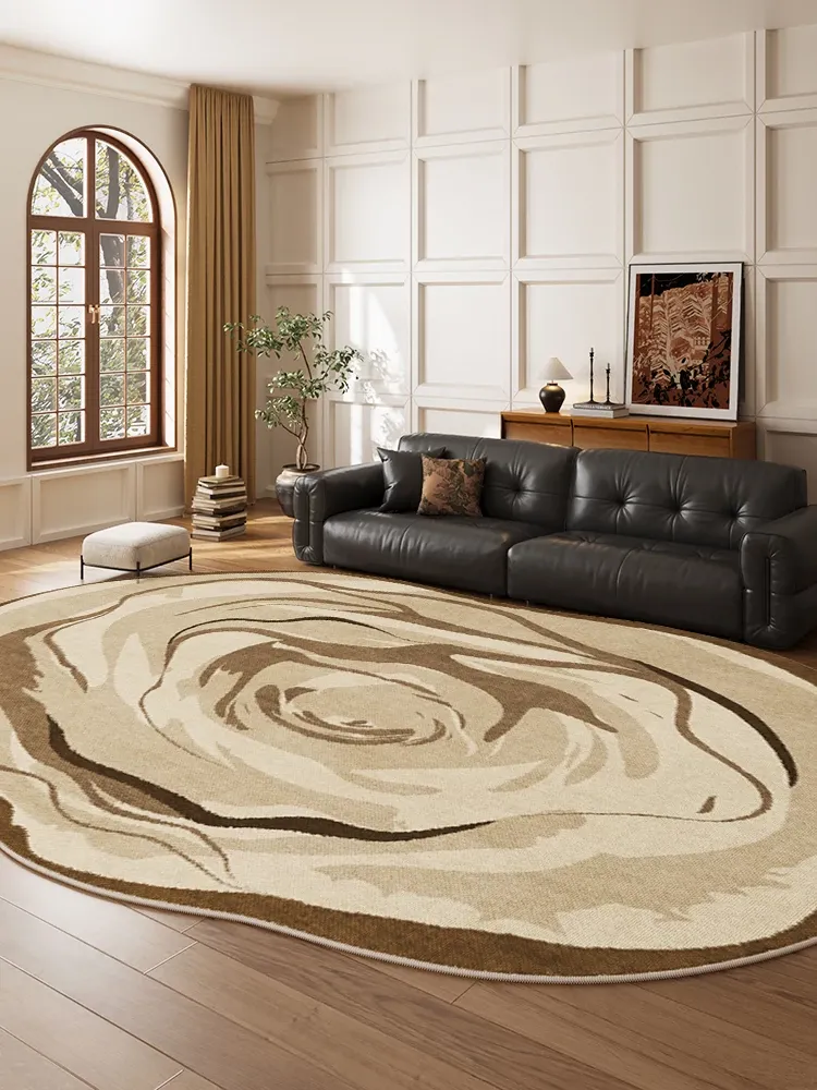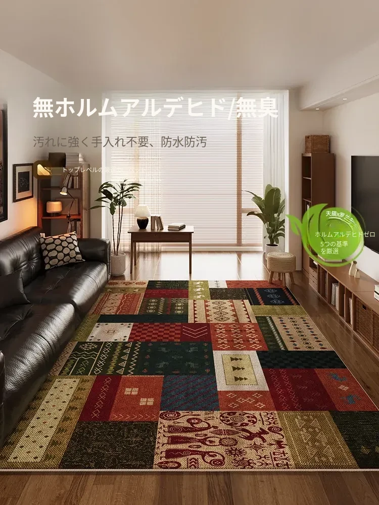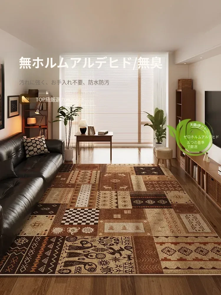 おしゃれなレトロ風防水リビングカーペット - テーブルやソファと相性抜群!お手入れ簡単で、汚れに強く、高級感あふれるデザイン。洗わずにサッと拭くだけでいつでも清潔!