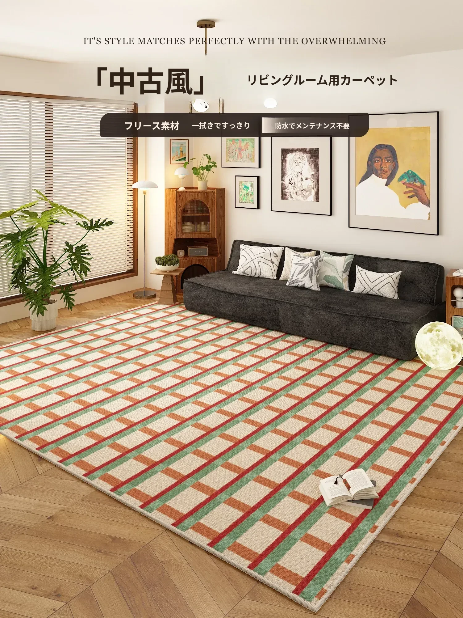 2024年最新款!中古風レトロチェック模様のリビングカーペット - ソファやテーブルの下にぴったり!寝室のベッドサイドにも最適。汚れに強く、滑り止め機能付きで安心。おしゃれで機能的なインテリアを演出します!