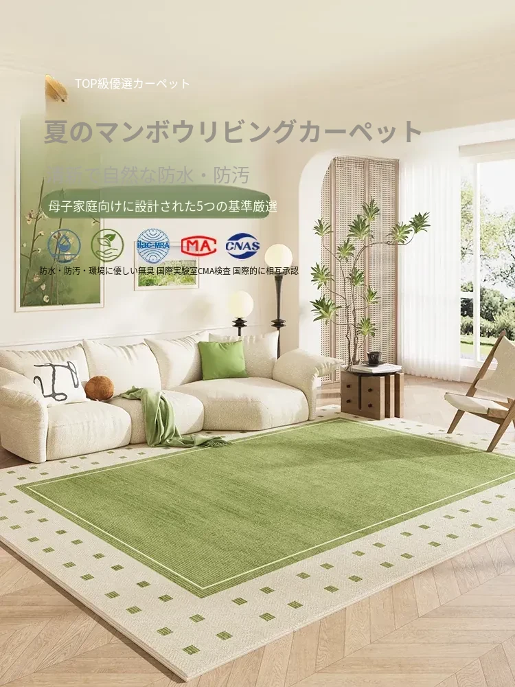フランス風クリームカラーのカーペット、リビングに最適!お手入れ不要で、グリーンのアメリカンスタイル、撥水・防汚効果付き。新作の洗わずに拭けるマットで、快適な空間を演出!