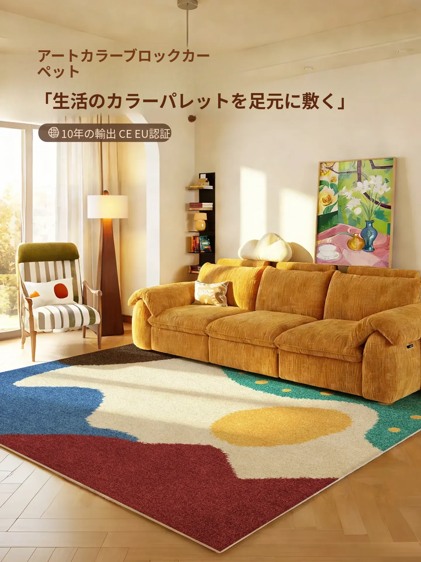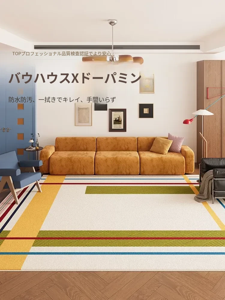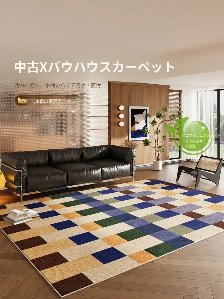 多バイン・カーペット|リビングに最適なミニマリストソファとテーブルの組み合わせ!防水・メンテナンス不要の中古カラーラグ|バウハウス風デザインでおしゃれな空間を演出!
