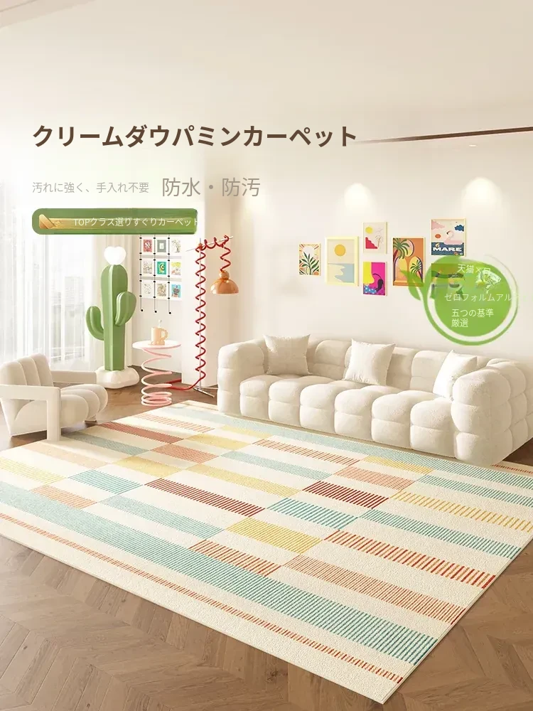 リビングルーム用防水カーペット!お手入れ不要で、ソファやテーブルの下にぴったり。寝室にも最適なクリーム風デザインで、洗わずに簡単に拭けるから、いつでも清潔感をキープ。心地よい空間を演出しましょう!
