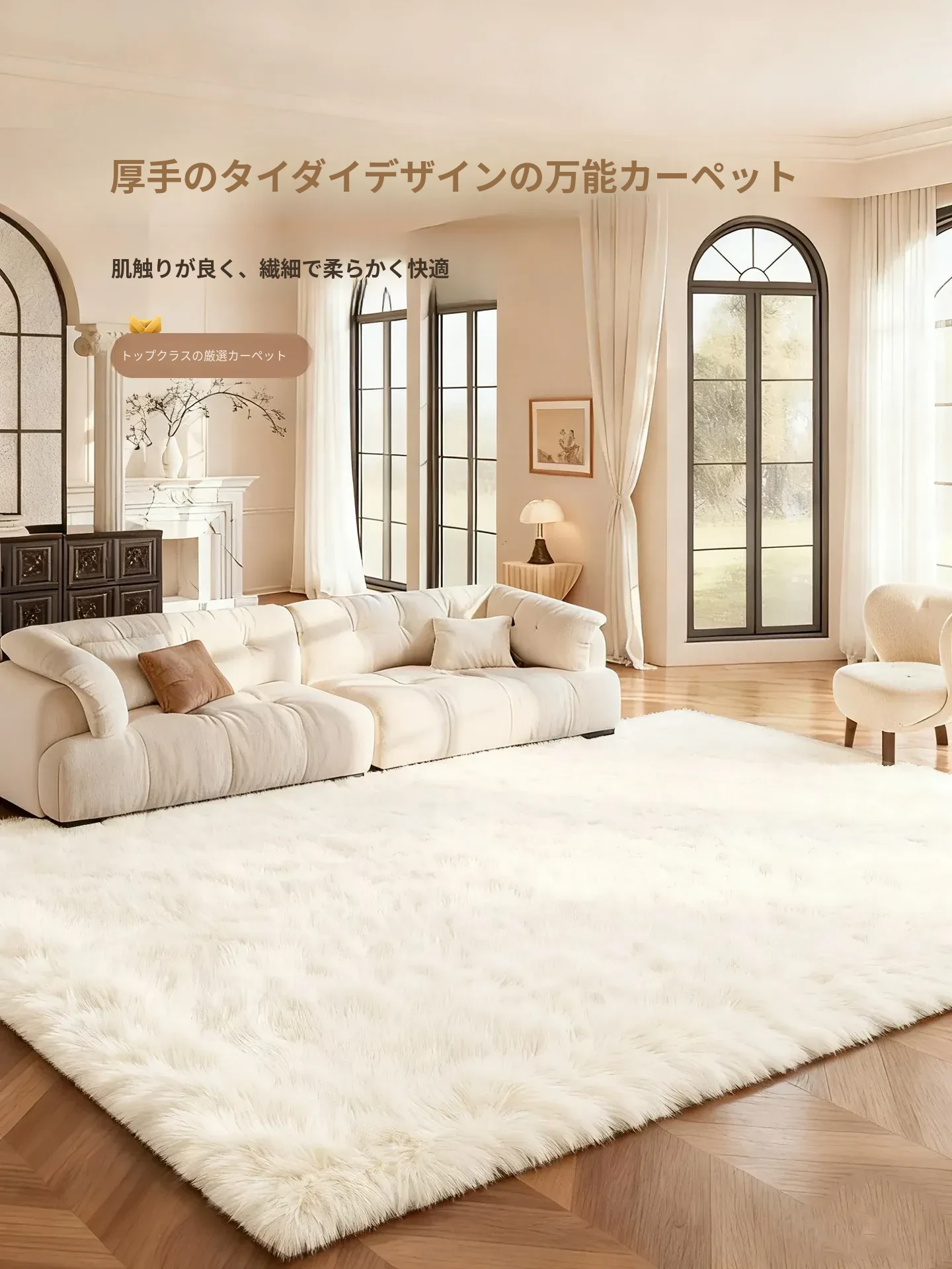 冬の暖かさを感じる!高級厚手クリームホワイトカーペット、リビングルームやベッドサイドに最適なふわふわラグ。ソファやテーブルの下にぴったりな、心地よい空間を演出します。