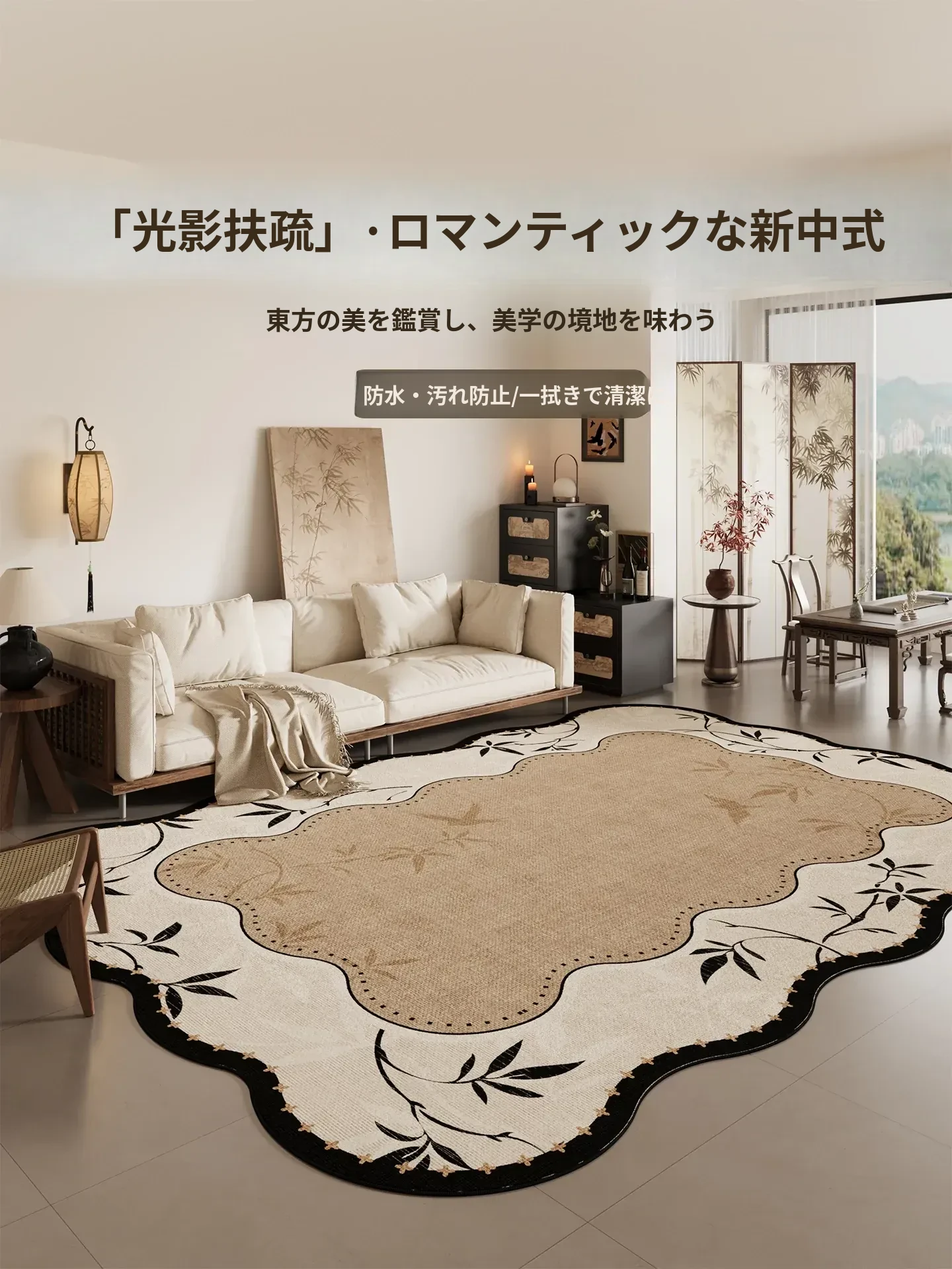 新中式デザインのラグマット - お手入れ簡単で洗濯不要!リビングや寝室にぴったりのモダンな和風スタイル。ソファやテーブルの下にも最適なユニークな形状で、部屋をおしゃれに演出します。新作登場!
