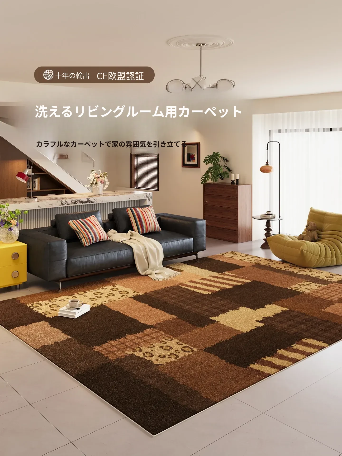 リビングルーム用高級感あふれる防水・防汚カーペット!寝室のベッドサイドマットや、ホコリから守るティーテーブル・ソファマットとしても最適。お手入れ簡単で洗濯不要、スタイリッシュな空間を演出します!
