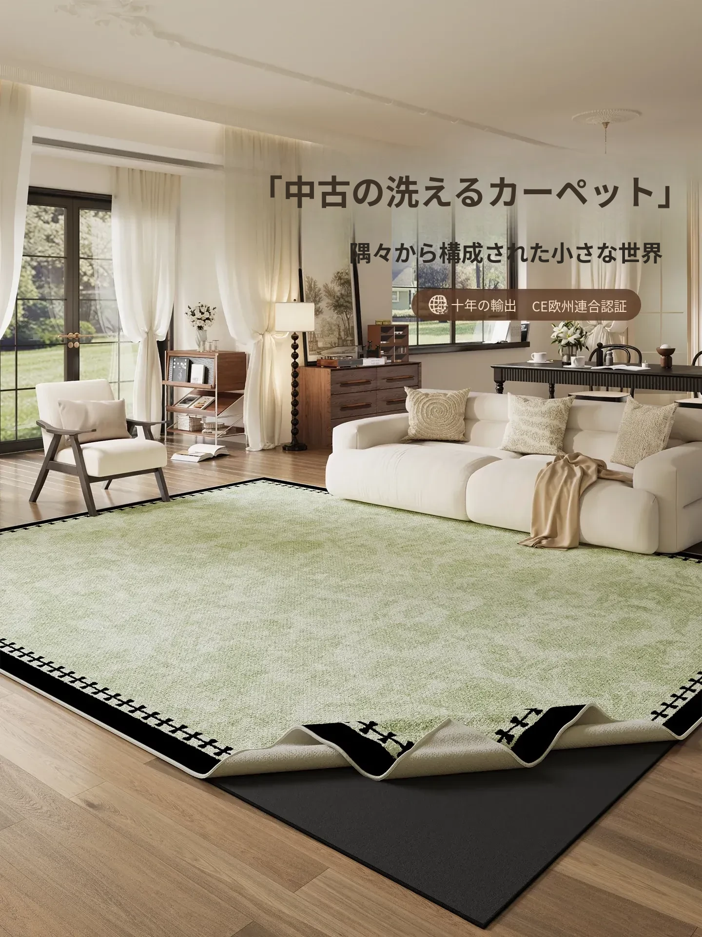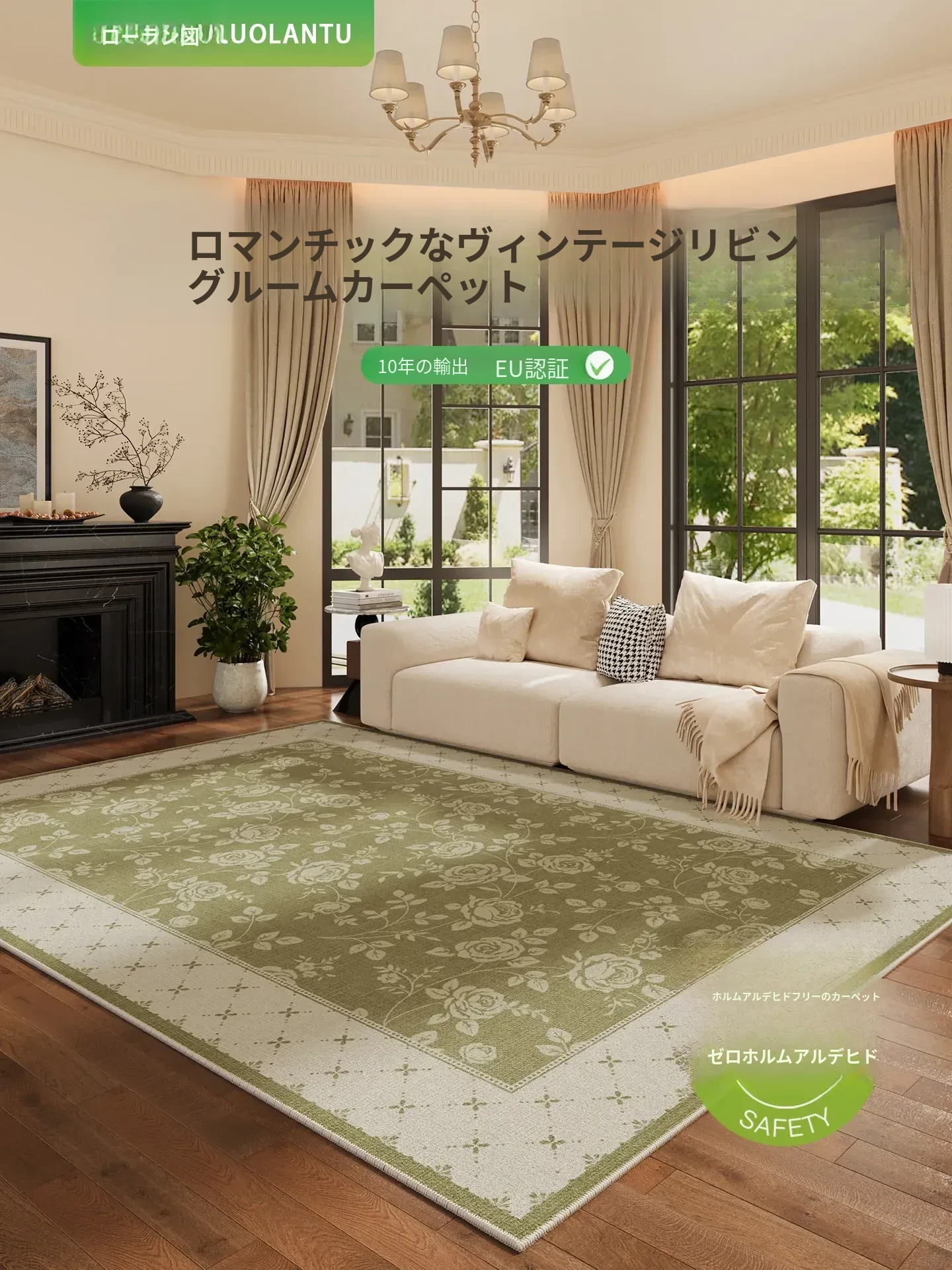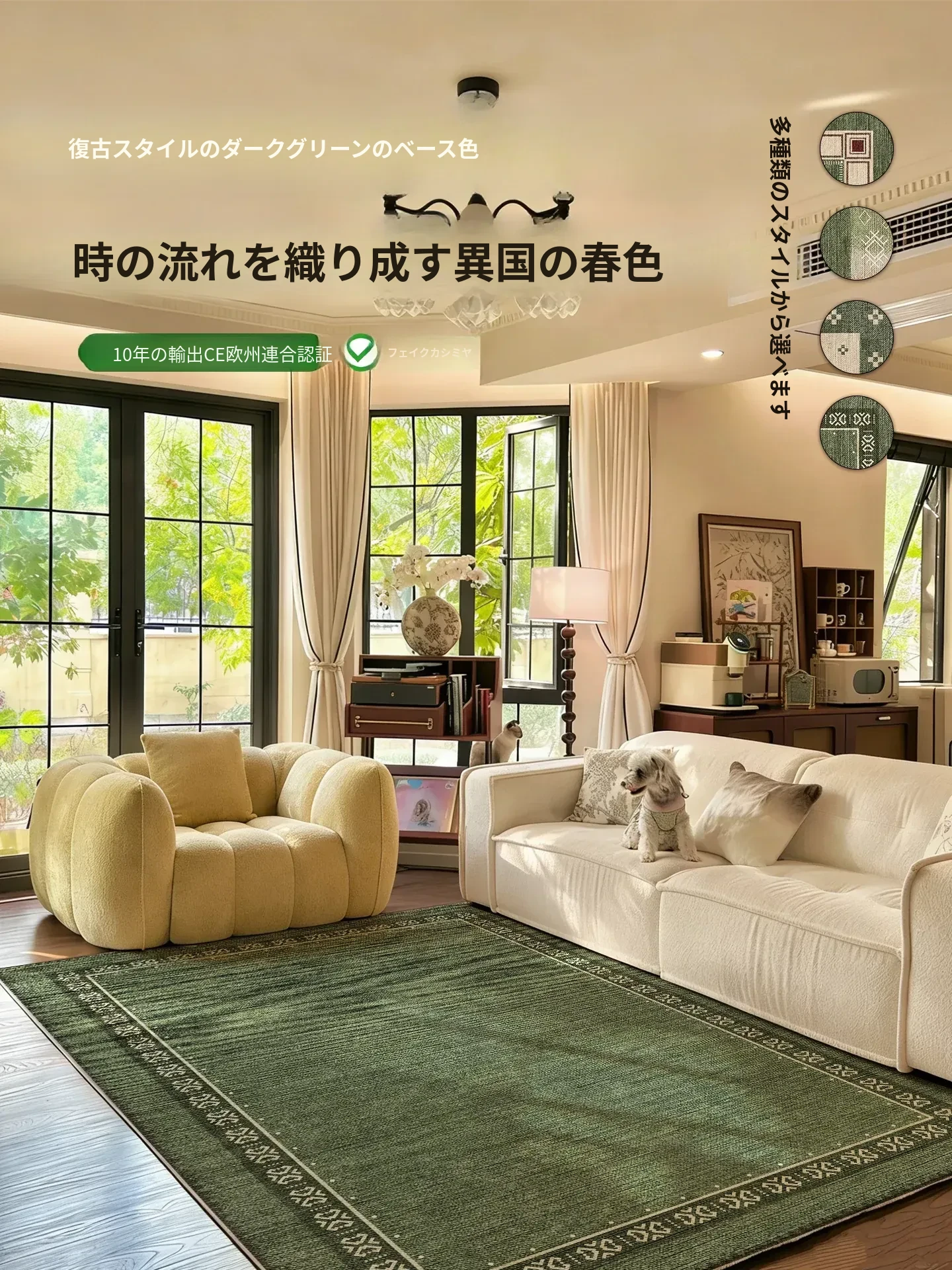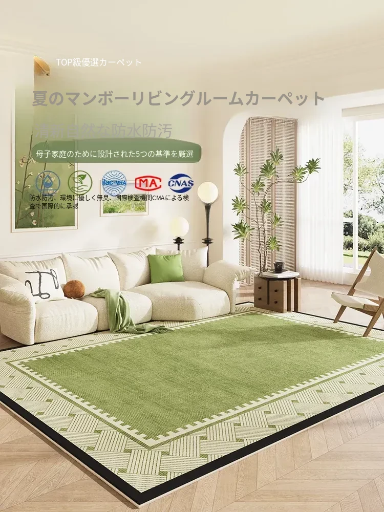 2025年新作!防水防污のグリーンカーペット - フランス風ソファとテーブルにぴったり!お手入れ簡単、クリーミーな雰囲気で寝室やリビングに最適。