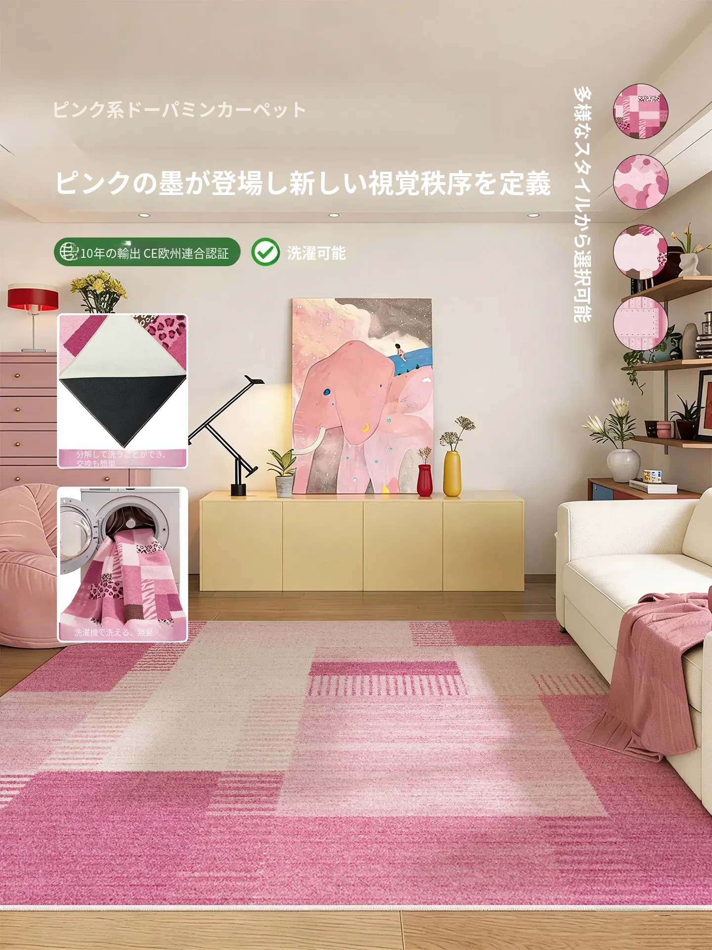 ピンクの取り外し可能なカーペット - リビングにぴったりな多幸感を与えるダブルレイヤーの洗濯機対応ソファ用・ベッドサイドマット