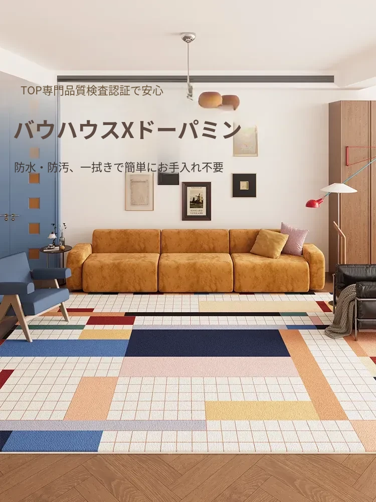 カラフルなレトロカーペット、リビングに最適なバウハウススタイルのミニマルソファ&コーヒーテーブルにぴったり!お手入れ簡単、撥水加工でおしゃれな寝室にも。新作登場!