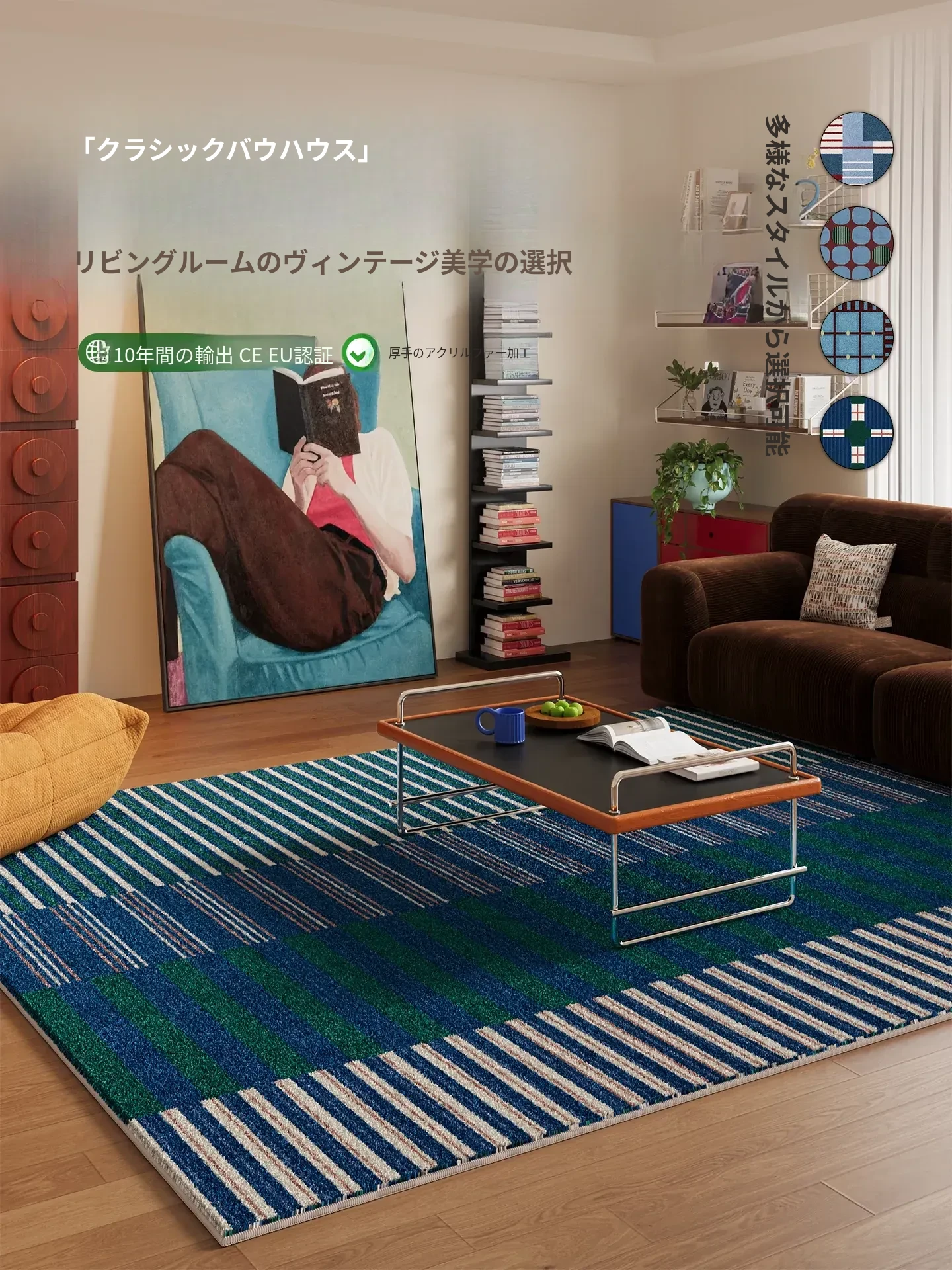 バウハウス風ブルーのレトロカーペット - リビングや寝室に最適!お手入れ不要で防水・防汚、洗練された高級感を演出します。快適な空間を手に入れましょう!