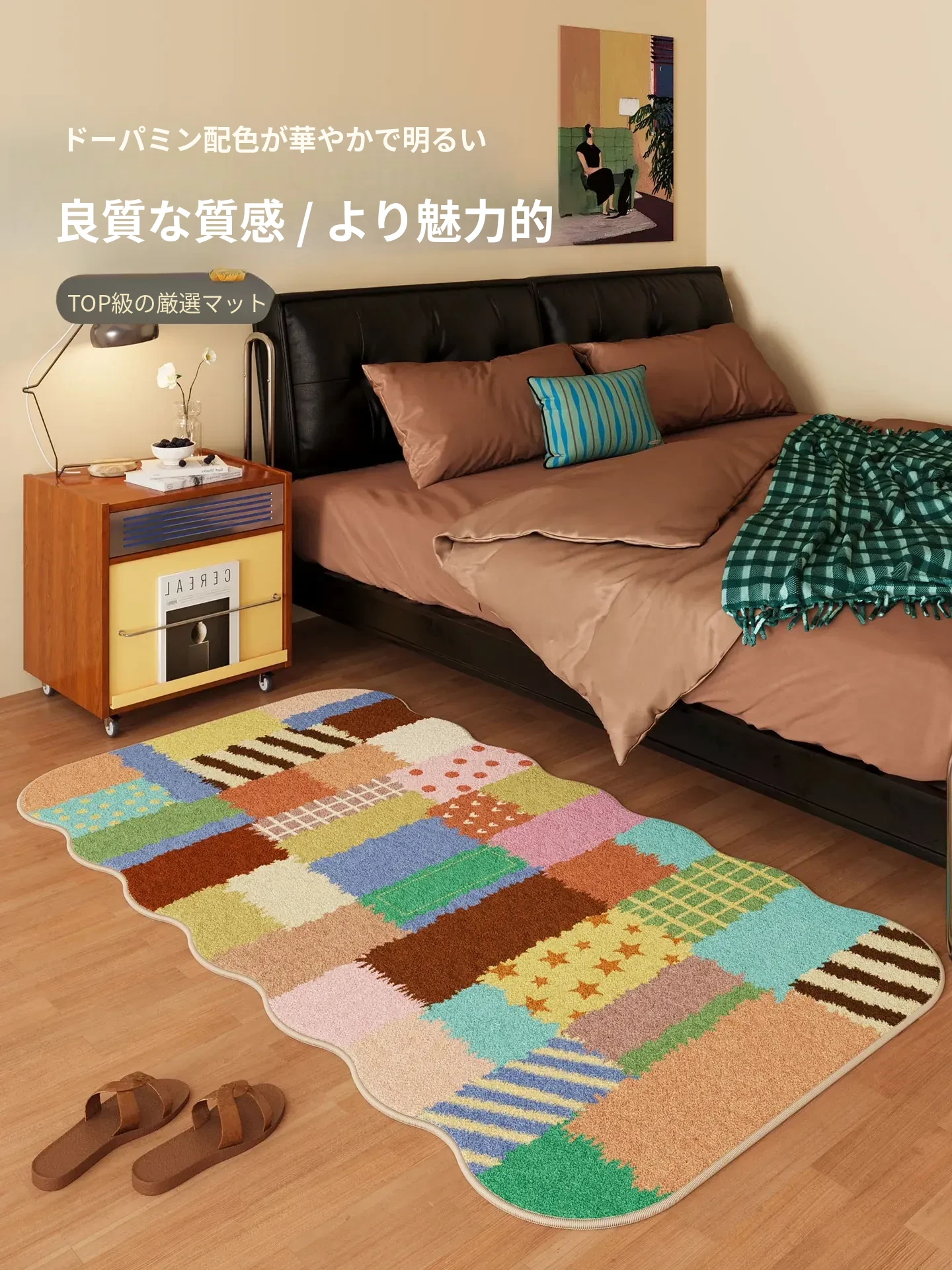 ドーパミンデザインのベッドサイドラグ!冬にぴったりのふわふわ素材で、主寝室やリビングに最適。滑り止め付きで安心、個性的な形状が魅力的。新しいバウハウススタイルで、あなたの部屋をおしゃれに演出します!