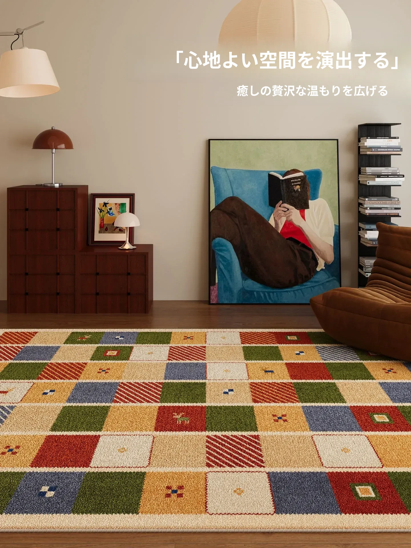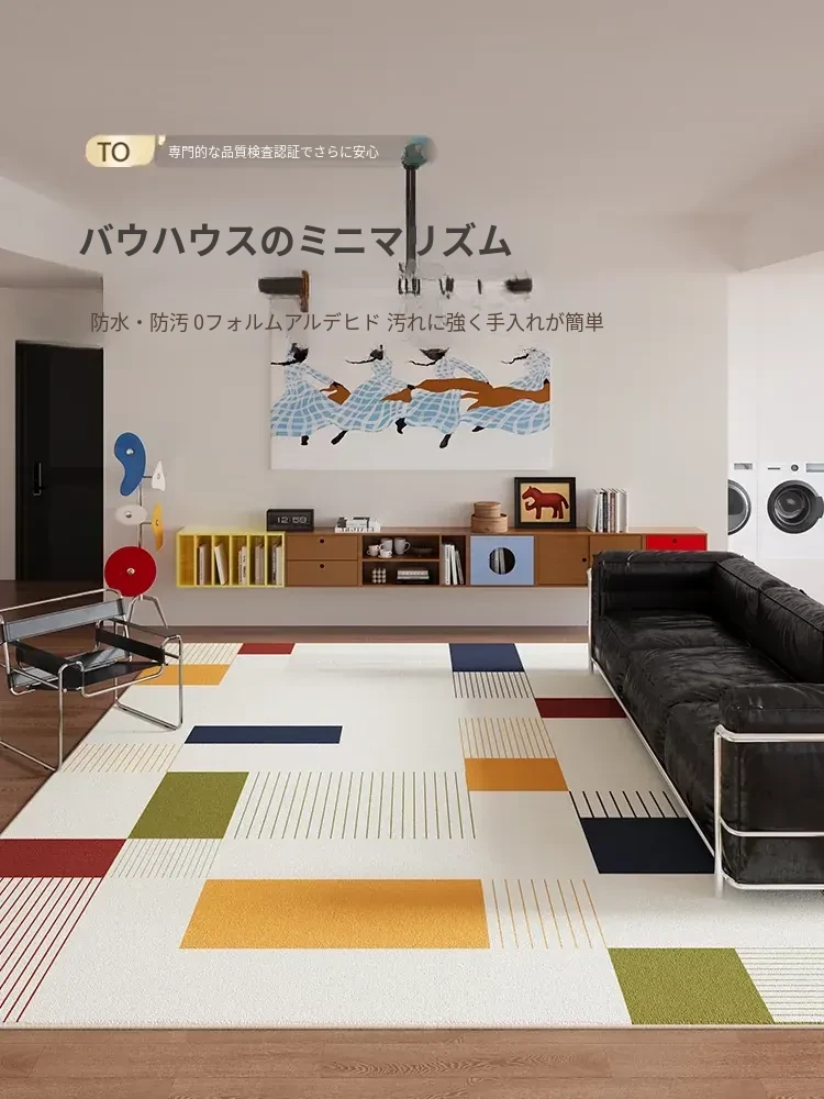 カラフルなレトロカーペット、リビングに最適なバウハウススタイルのミニマルソファ&コーヒーテーブルにぴったり!お手入れ簡単、撥水加工でおしゃれな寝室にも。新作登場!