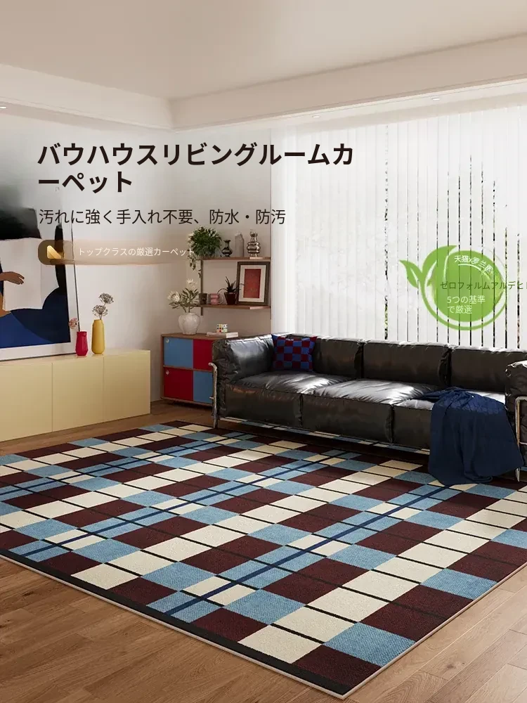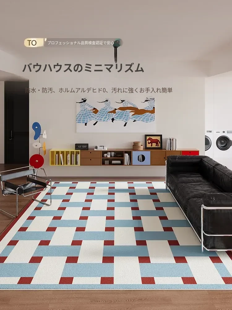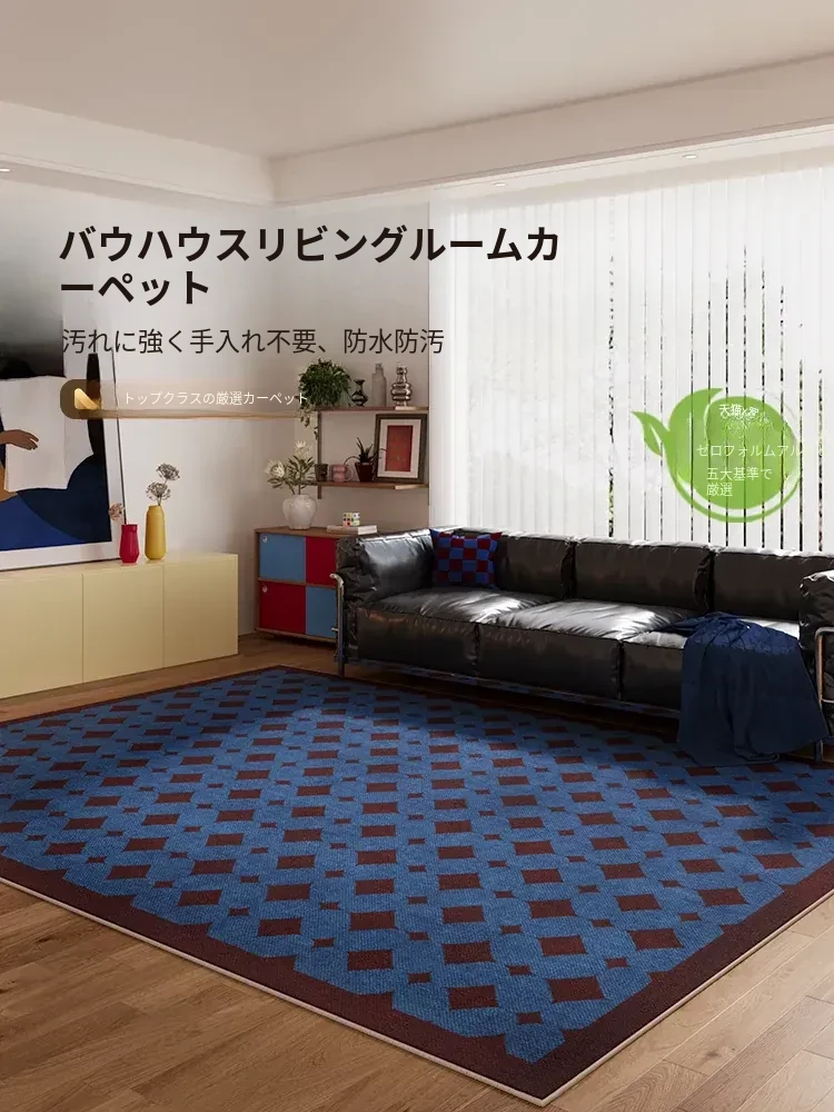 バウハウス風のレトロラグ - 防水で高級感溢れるミニマリストデザイン!リビングや寝室にぴったりのブルーカーペット。ソファやテーブルの下にも最適!お手入れ簡単、洗わずに拭くだけでOK!
