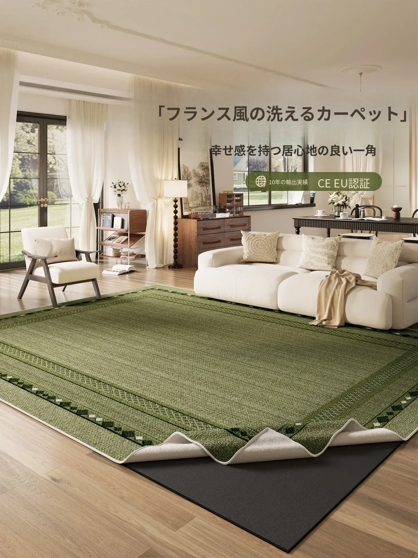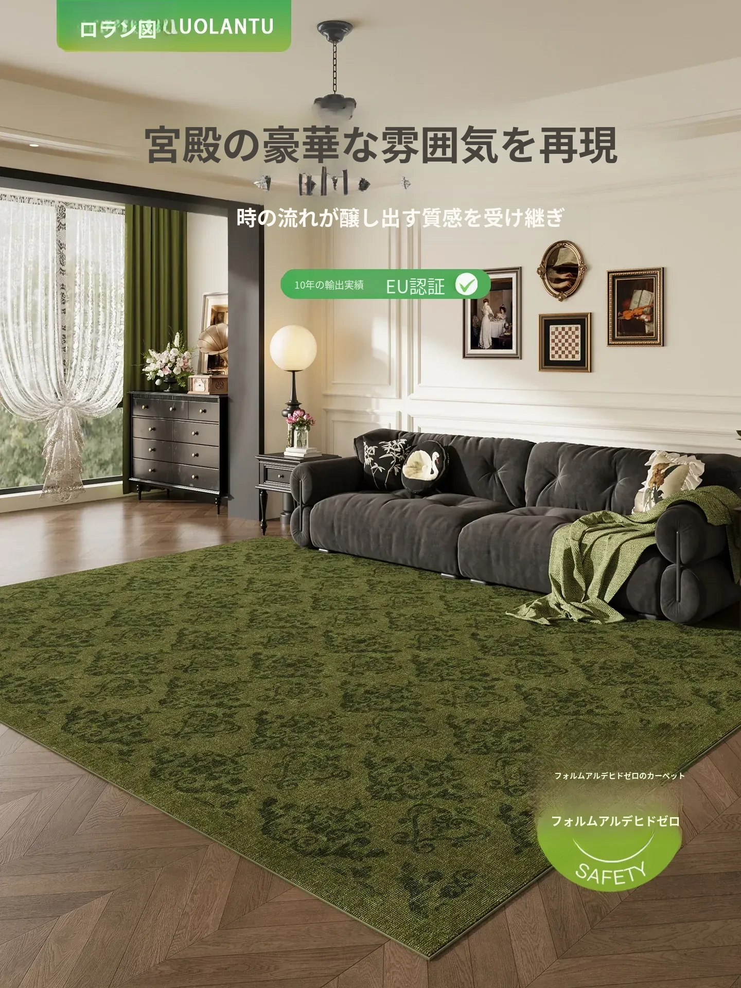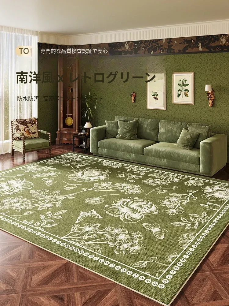 レトログリーンリビングルームカーペット - お手入れ不要で簡単お掃除!ベッドサイドやソファにピッタリな高級感あふれる防水・防汚マット。おしゃれな空間を演出し、快適さをプラスします。