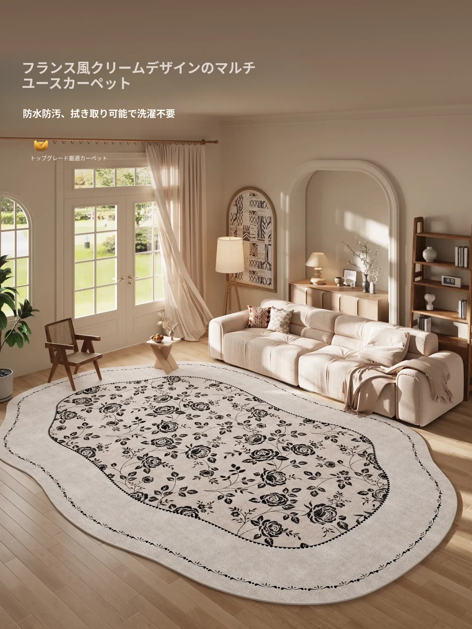 コージーなフレンチスタイルのクリームカラーラグ、洗練されたソファとテーブルセット!お手入れ簡単で防水・防汚、2025年新作でお部屋を華やかに演出します。