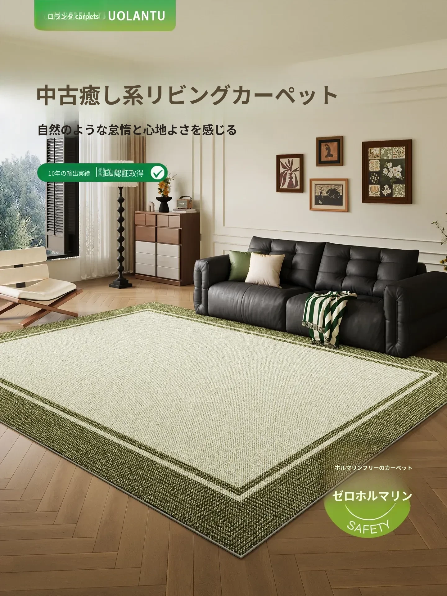 高級感あふれるグリーンカーペット!防水・防汚・手入れ不要で滑り止め付き。おしゃれな中古風レトロデザインで、リビングを華やかに彩る新作登場!