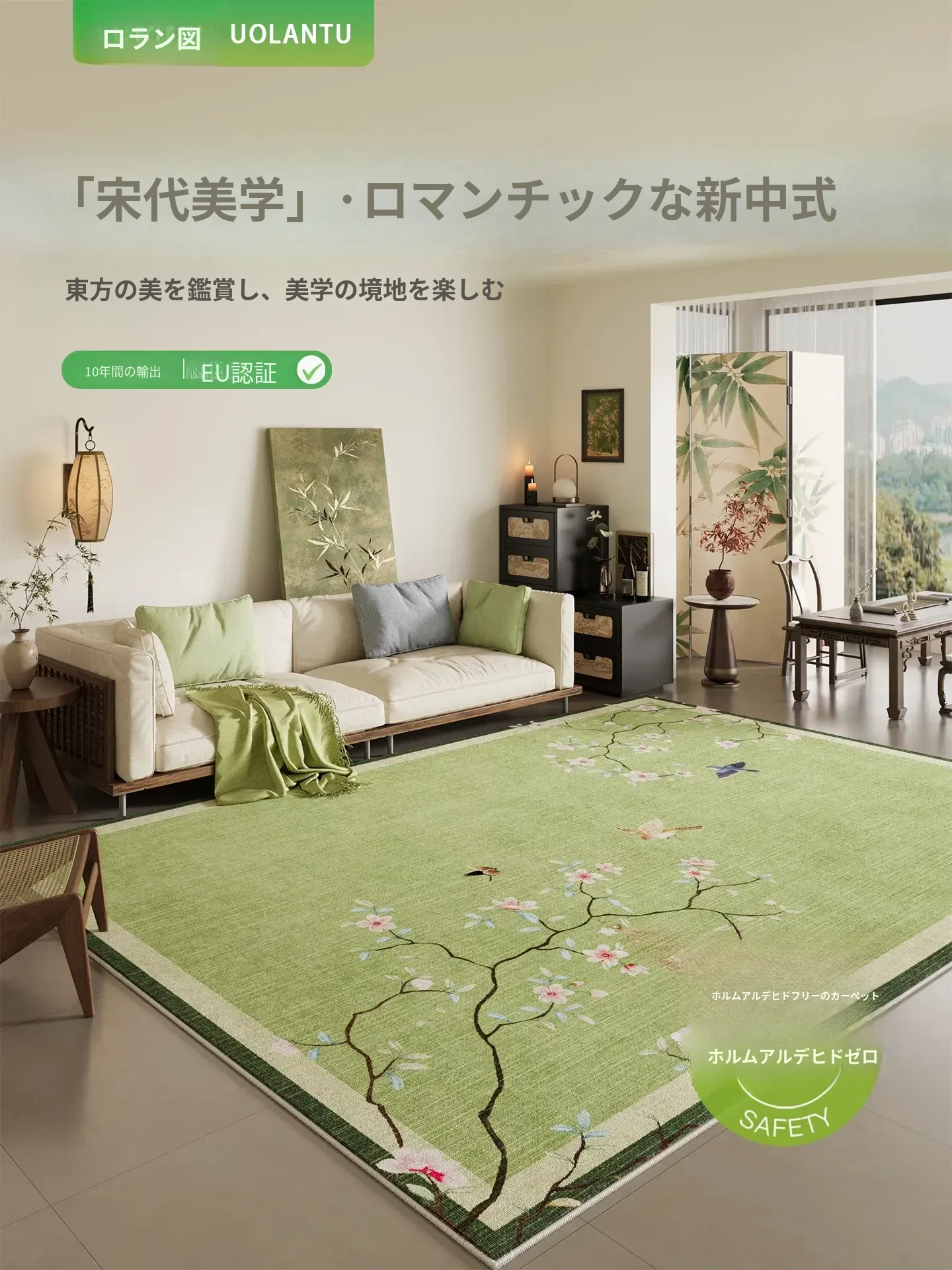 新しい緑の中式カーペット - リビングルームや寝室に最適!手入れ不要で宋代の美学を取り入れ、ウォータープルーフ&防汚設計。おしゃれな茶卓にもぴったりな最新デザイン!