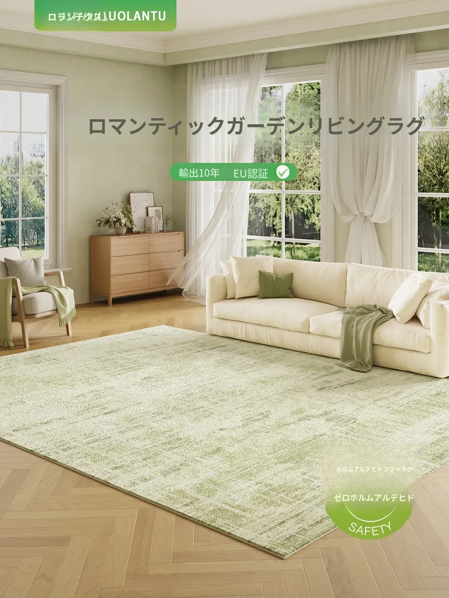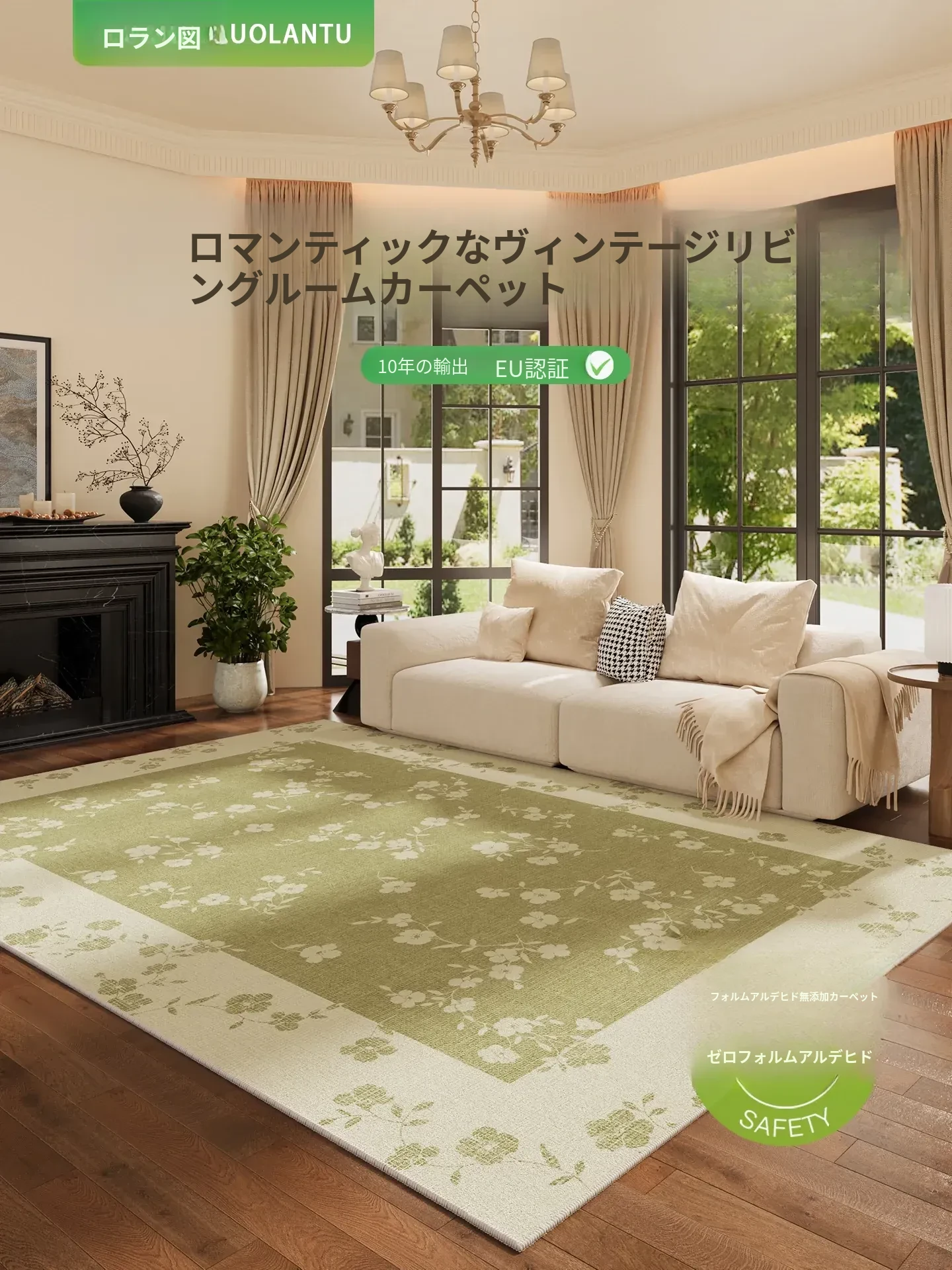 防水・防汚のグリーンカーペット、フレンチスタイルのソファとコーヒーテーブルにぴったり!手間いらずでおしゃれなクリーム風デザイン。2025年新作、リビングやベッドサイドに最適!